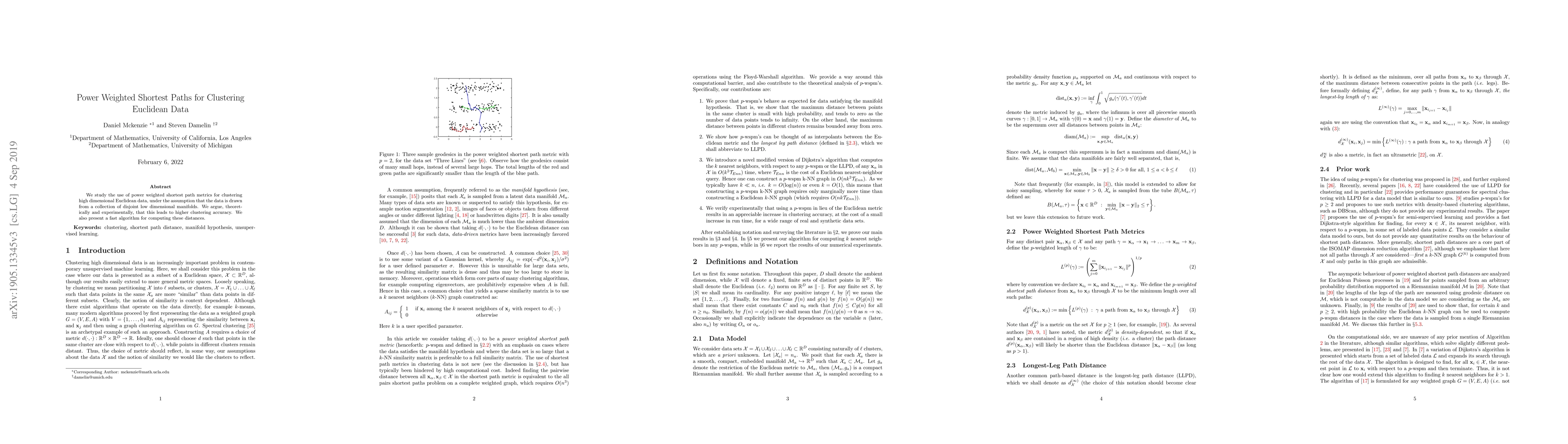 We study the use of power weighted shortest path distance functions for clustering high dimensional Euclidean data, under the assumption that the data is drawn from a collection of disjoint low dimensional manifolds. We argue, theoretically and experimentally, that this leads to higher clustering accuracy. We also present a fast algorithm for computing these distances.