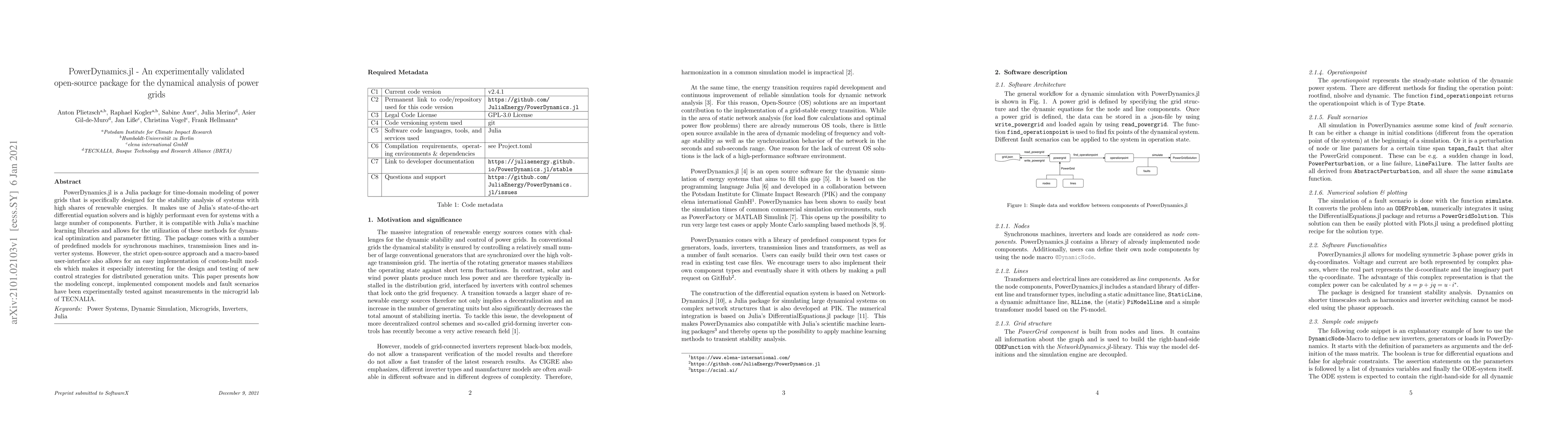 PowerDynamics.jl is an open-source Julia package for modeling power grids, designed for stability analysis with high renewable energy shares. It has been experimentally validated against real-world microgrid lab data for accuracy.