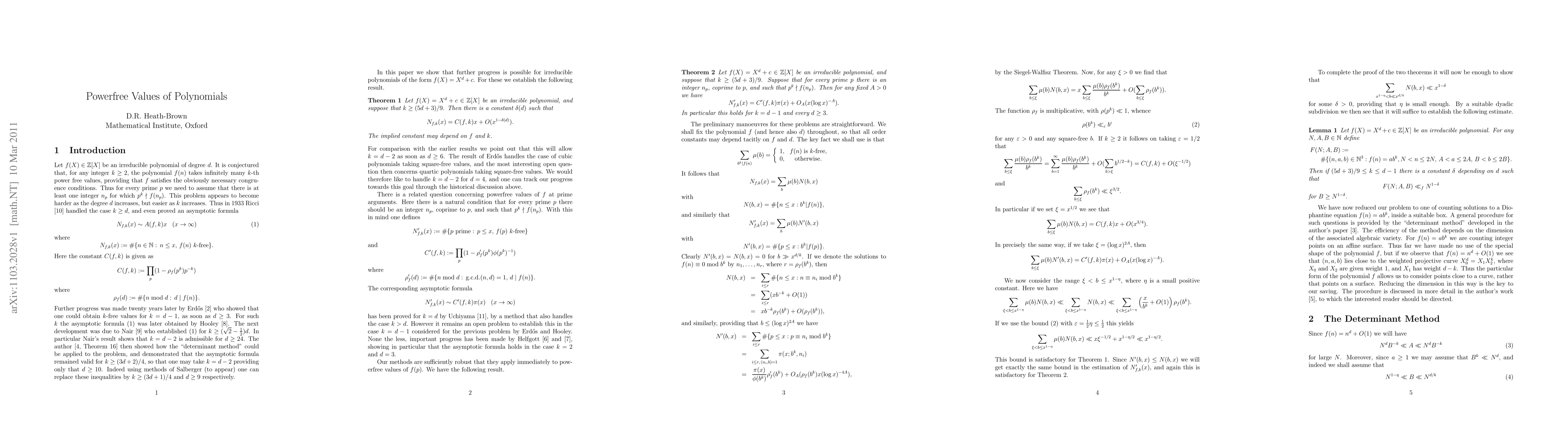 For irreducible integer polynomials $f(n)=n^d+c$ we prove an asymptotic formula for the number of $k$-th power free values taken by $f(n)$, for $n$ running up to $x$, subject to the condition $k\ge (5d+3)/9$. This improves earlier results in which the condition was $k\ge (3d+1)/4$. We also show that one can handle $f(p)$ for prime arguments $p$, for the same range of $k$.