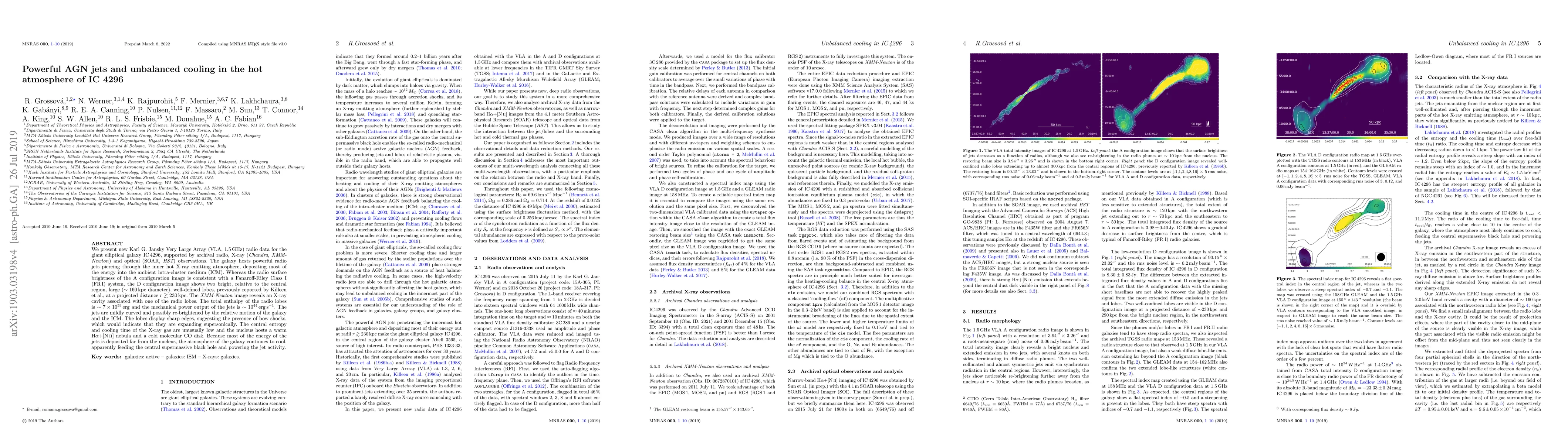 This study uses VLA and archival data to analyze the powerful AGN jets in IC 4296, revealing large, expanding radio lobes and X-ray cavities. The jets deposit significant energy into the intra-cluster medium, while the galaxy's atmosphere remains unusually cool, suggesting ongoing cooling and fueling of the central black hole.