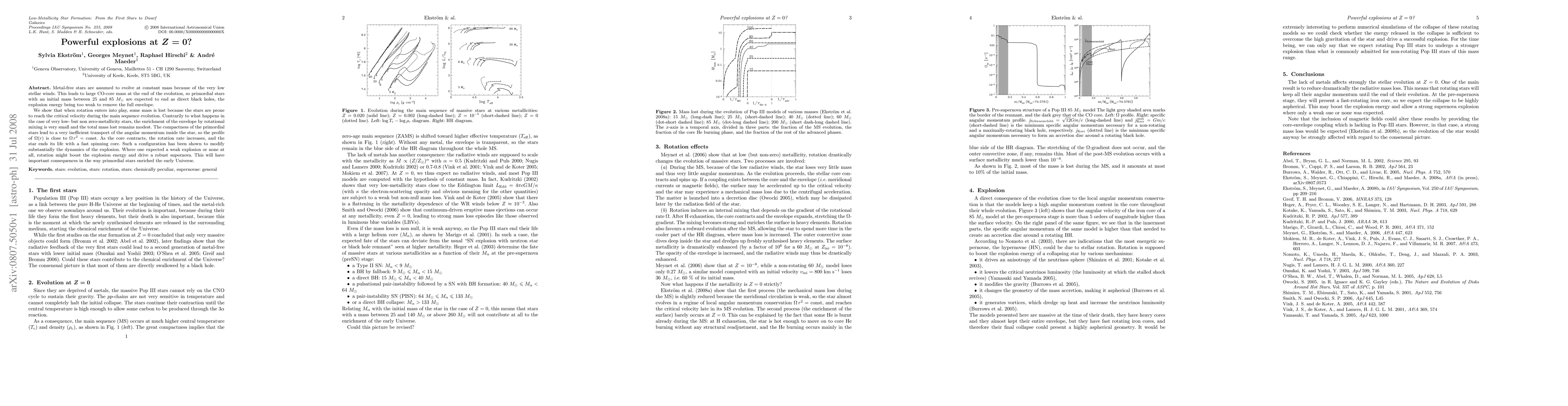 Metal-free stars are assumed to evolve at constant mass because of the very low stellar winds. This leads to large CO-core mass at the end of the evolution, so primordial stars with an initial mass between 25 and 85 Msol are expected to end as direct black holes, the explosion energy being too weak to remove the full envelope. We show that when rotation enters into play, some mass is lost because the stars are prone to reach the critical velocity during the main sequence evolution. Contrarily to what happens in the case of very low- but non zero-metallicity stars, the enrichment of the envelope by rotational mixing is very small and the total mass lost remains modest. The compactness of the primordial stars lead to a very inefficient transport of the angular momentum inside the star, so the profile of Omega(r) is close to Omega r^2 = const. As the core contracts, the rotation rate increases, and the star ends its life with a fast spinning core. Such a configuration has been shown to modify substantially the dynamics of the explosion. Where one expected a weak explosion or none at all, rotation might boost the explosion energy and drive a robust supernova. This will have important consequences in the way primordial stars enriched the early Universe.