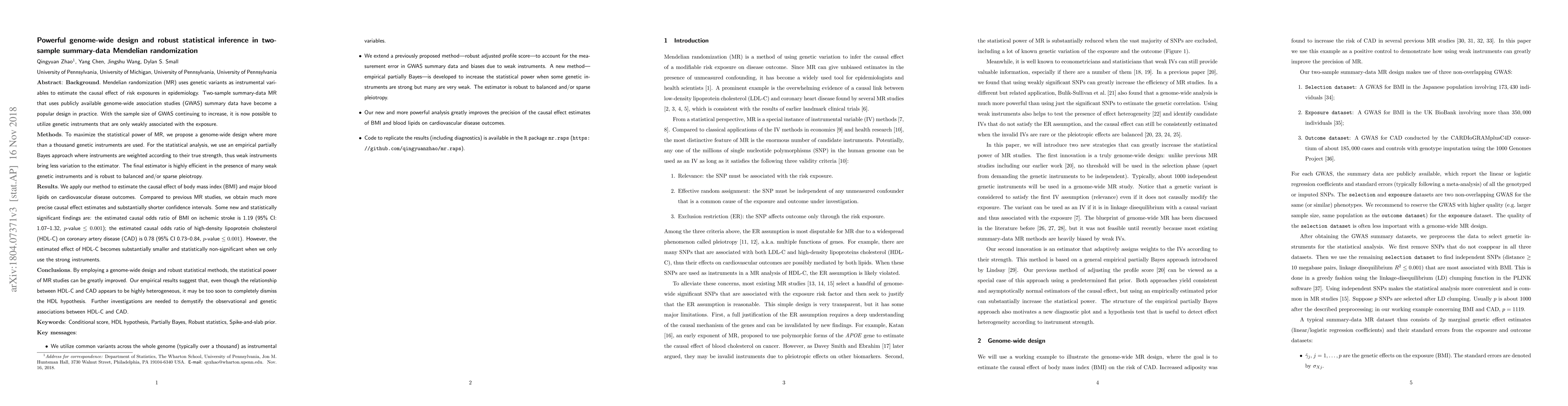 This paper proposes a genome-wide design and robust statistical inference for two-sample summary-data Mendelian randomization (MR) to estimate causal effects, using thousands of genetic instruments. The empirical partially Bayes approach weights instruments by strength, enhancing efficiency and robustness to pleiotropy. The method reveals significant causal effects of BMI on ischemic stroke and HDL-C on coronary artery disease, but shows HDL-C's effect diminishes with strong instruments, suggesting caution in dismissing HDL's benefits.