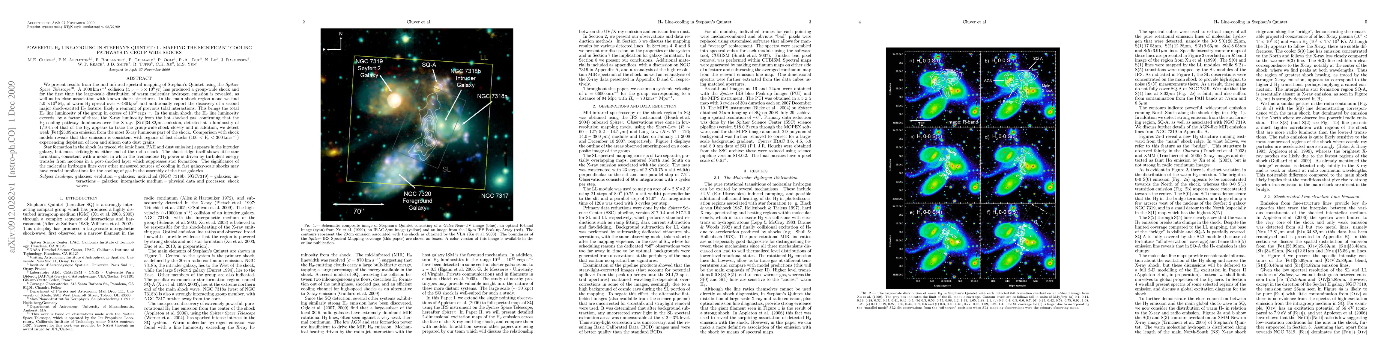Spitzer observations reveal a group-wide shock in Stephan's Quintet with significant warm molecular hydrogen (H2) emission, exceeding X-ray luminosity by three times. H2 cooling dominates over X-ray cooling, with additional [Si II] and [Fe II] emission tracing fast shock regions and indicating depletion of iron and silicon onto dust grains. Star formation is noted in the intruder galaxy and at shock ends, but not along the ridge, suggesting H2 power driven by turbulent energy transfer from post-shocked layers. This has implications for cooling in early galaxy assembly.
