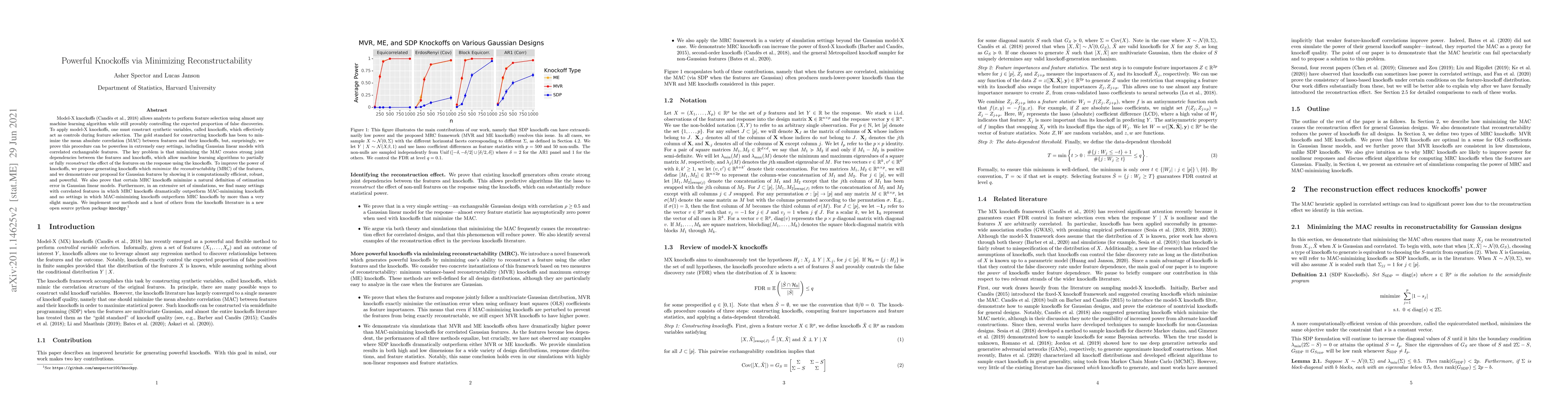 This paper proposes a new method for generating knockoffs that minimizes reconstructability (MRC) to improve feature selection power, demonstrating its effectiveness over the traditional mean absolute correlation (MAC) method, especially in settings with correlated features. The MRC method is shown to be computationally efficient, robust, and powerful, outperforming MAC knockoffs in extensive simulations.