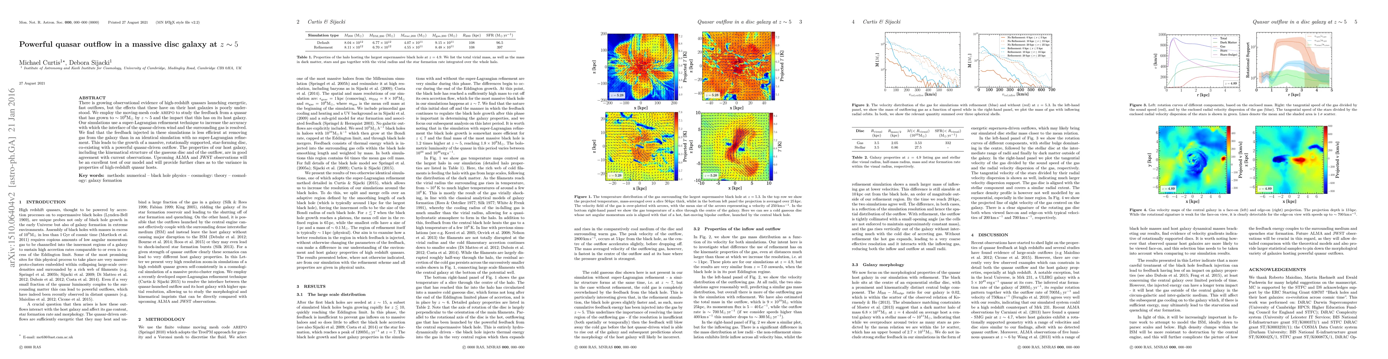 There is growing observational evidence of high-redshift quasars launching energetic, fast outflows, but the effects that these have on their host galaxies is poorly understood. We employ the moving-mesh code AREPO to study the feedback from a quasar that has grown to $\sim 10^9 M_\odot$ by $z \sim 5$ and the impact that this has on its host galaxy. Our simulations use a super-Lagrangian refinement technique to increase the accuracy with which the interface of the quasar-driven wind and the surrounding gas is resolved. We find that the feedback injected in these simulations is less efficient at removing gas from the galaxy than in an identical simulation with no super-Lagrangian refinement. This leads to the growth of a massive, rotationally supported, star-forming disc, co-existing with a powerful quasar-driven outflow. The properties of our host galaxy, including the kinematical structure of the gaseous disc and of the outflow, are in good agreement with current observations. Upcoming ALMA and JWST observations will be an excellent test of our model and will provide further clues as to the variance in properties of high-redshift quasar hosts.
