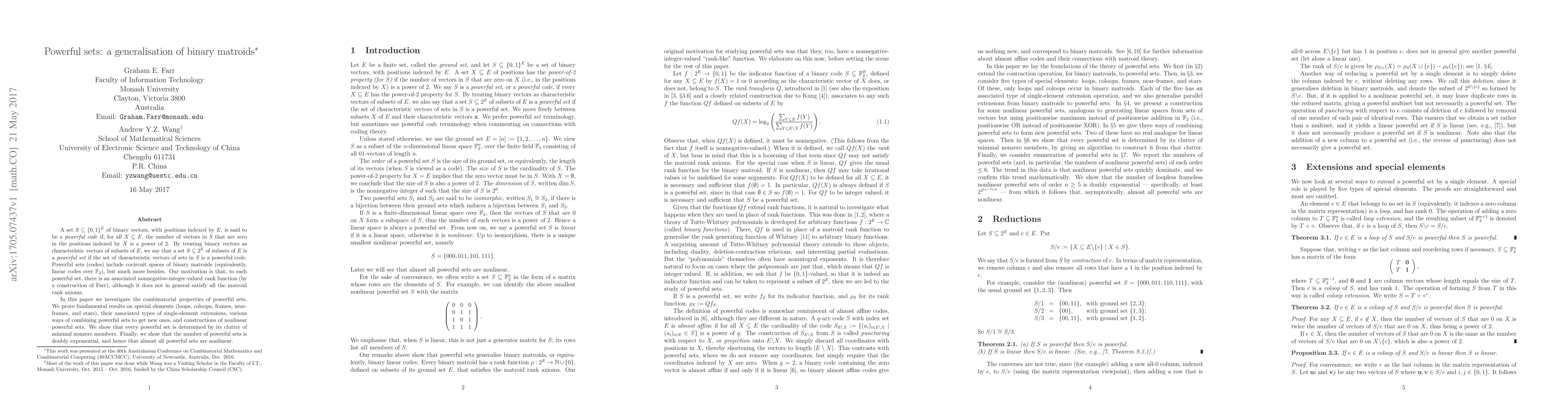 This paper explores powerful sets, a generalization of binary matroids, characterized by a rank function that counts subsets' characteristic vectors as powers of 2. It investigates their combinatorial properties, including special elements and constructions, and demonstrates that almost all powerful sets are nonlinear.
