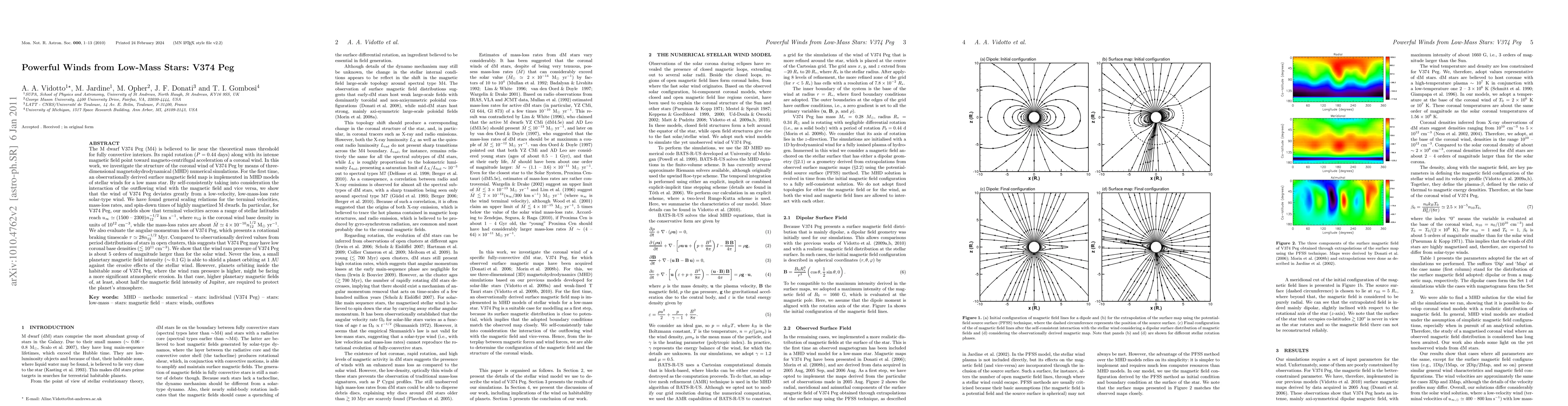 The rapid rotation (P=0.44 d) of the M dwarf V374Peg (M4) along with its intense magnetic field point toward magneto-centrifugal acceleration of a coronal wind. In this work, we investigate the structure of the wind of V374Peg by means of 3D magnetohydrodynamical (MHD) numerical simulations. For the first time, an observationally derived surface magnetic field map is implemented in MHD models of stellar winds for a low mass star. We show that the wind of V374Peg deviates greatly from a low-velocity, low-mass-loss rate solar-type wind. We find general scaling relations for the terminal velocities, mass-loss rates, and spin-down times of highly magnetized M dwarfs. In particular, for V374Peg, our models show that terminal velocities across a range of stellar latitudes reach ~(1500-2300) n_{12}^{-1/2} km/s, where n_{12} is the coronal wind base density in units of 10^{12} cm^{-3}, while the mass-loss rates are about 4 x 10^{-10} n_{12}^{1/2} Msun/yr. We also evaluate the angular-momentum loss of V374Peg, which presents a rotational braking timescale ~28 n_{12}^{-1/2} Myr. Compared to observationally derived values from period distributions of stars in open clusters, this suggests that V374Peg may have low coronal base densities (< 10^{11} cm^{-3}). We show that the wind ram pressure of V374Peg is about 5 orders of magnitude larger than for the solar wind. Nevertheless, a small planetary magnetic field intensity (~ 0.1G) is able to shield a planet orbiting at 1 AU against the erosive effects of the stellar wind. However, planets orbiting inside the habitable zone of V374Peg, where the wind ram pressure is higher, might be facing a more significant atmospheric erosion. In that case, higher planetary magnetic fields of, at least, about half the magnetic field intensity of Jupiter, are required to protect the planet's atmosphere.