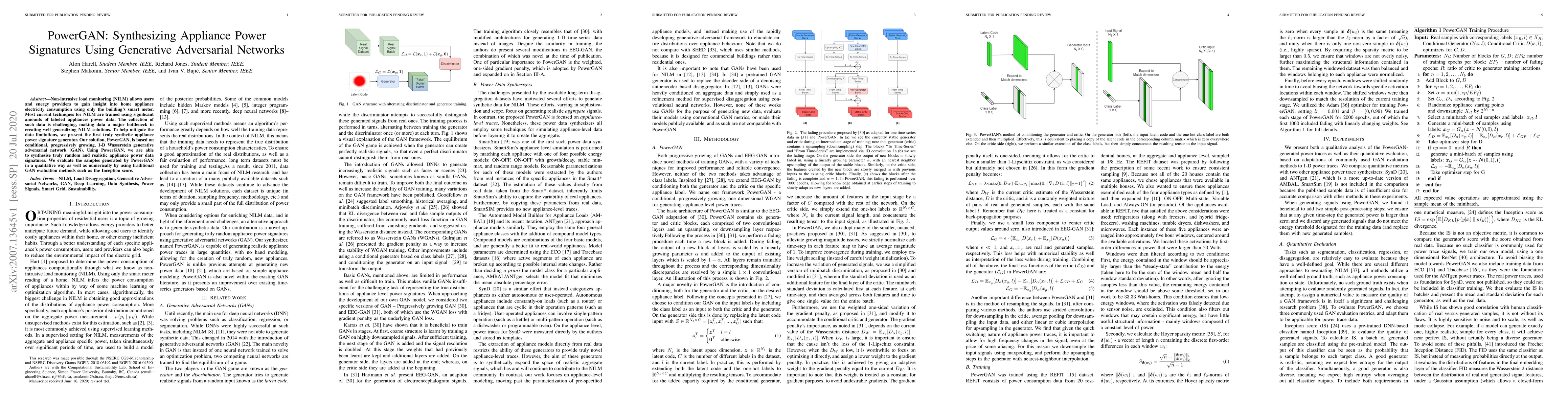 PowerGAN synthesizes appliance power signatures using a conditional, progressively growing 1-D Wasserstein GAN to address the data scarcity in non-intrusive load monitoring (NILM). The generated synthetic data is evaluated qualitatively and numerically, showing realistic and useful signatures for NILM training.