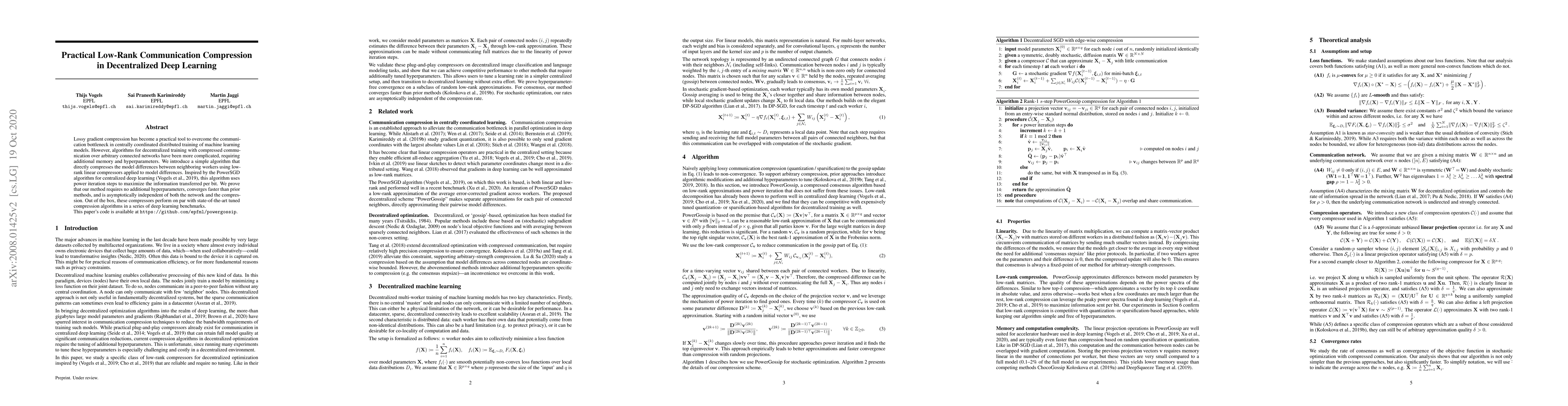 Title: PowerGossip: Practical Low-Rank Communication Compression in Decentralized Deep Learning Summary: This paper introduces a simple low-rank communication compression algorithm for decentralized deep learning, achieving faster convergence and comparable performance to state-of-the-art methods without additional hyperparameters or memory requirements.