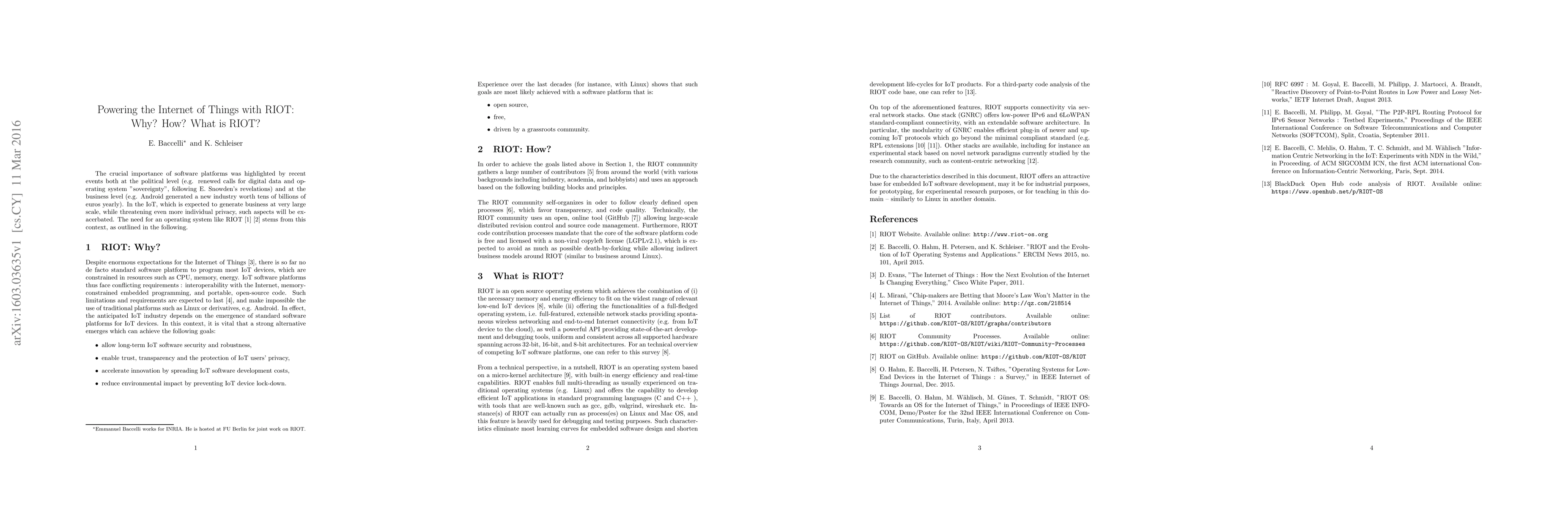 Summary: This paper explores the significance of software platforms, particularly the RIOT operating system, in the context of the Internet of Things. It discusses the need for data and operating system sovereignty and highlights RIOT's key technical features and non-technical aspects.