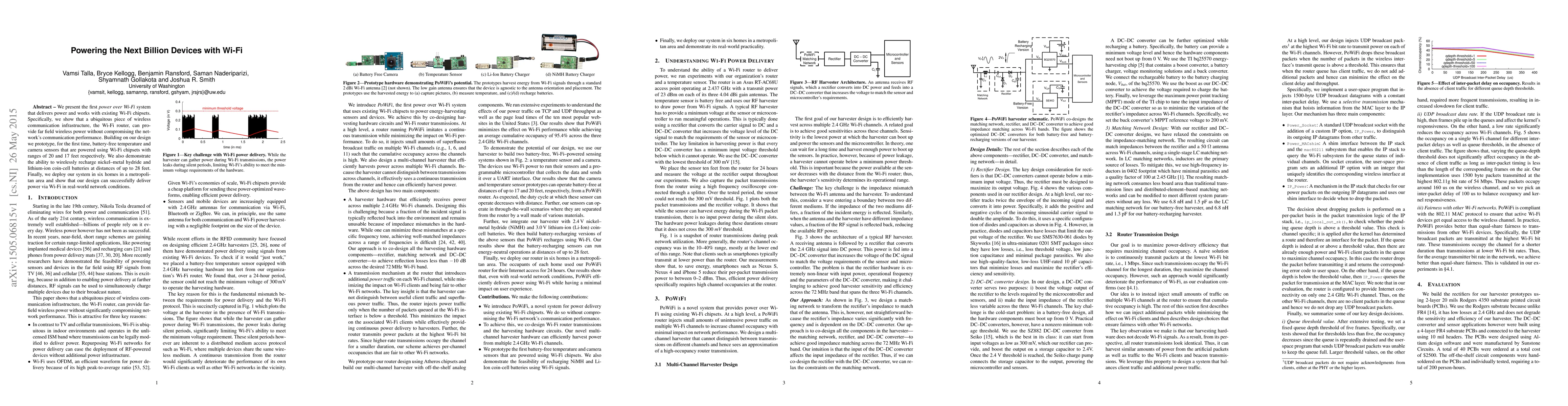 This paper introduces a power over Wi-Fi system that enables wireless power delivery using existing Wi-Fi routers without affecting communication performance. The system powers battery-free sensors and recharges coin-cell batteries over distances up to 28 feet, validated through real-world deployment in six homes.