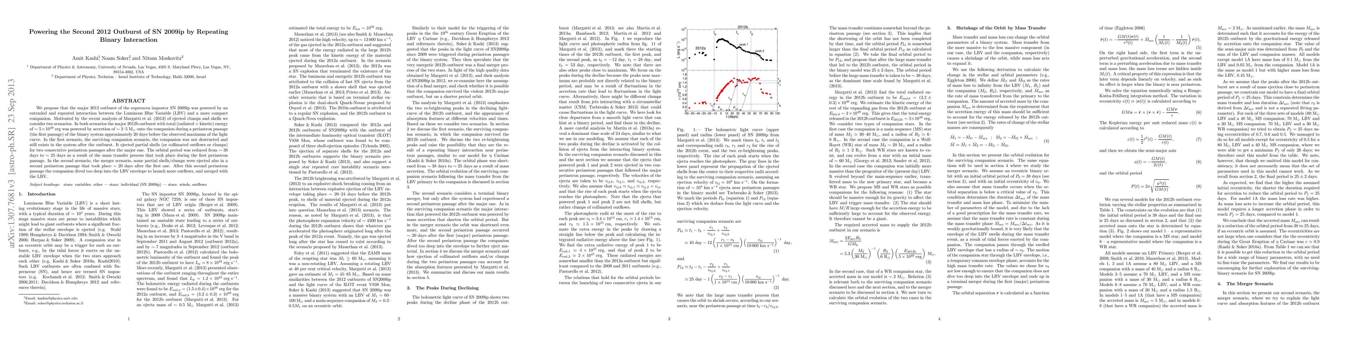 We propose that the major 2012 outburst of the supernova impostor SN 2009ip was powered by an extended and repeated interaction between the Luminous Blue Variable (LBV) and a more compact companion. Motivated by the recent analysis of Margutti et al. (2013) of ejected clumps and shells we consider two scenarios. In both scenarios the major 2012b outburst with total (radiated + kinetic) energy of ~5 x 10^{49} erg was powered by accretion of 2-5 solar masses onto the companion during a periastron passage (the first passage) of the binary system approximately 20 days before the observed maximum of the light curve. In the first scenario, the surviving companion scenario, the companion was not destructed and still exists in the system after the outburst. It ejected partial shells (or collimated outflows or clumps) for two consecutive periastron passages after the major one. The orbital period was reduced from ~38 days to ~25 days as a result of the mass transfer process that took place during the first periastron passage. In the second scenario, the merger scenario, some partial shells/clumps were ejected also in a second periastron passage that took place ~20 days after the first one. After this second periastron passage the companion dived too deep into the LBV envelope to launch more outflows, and merged with the LBV.