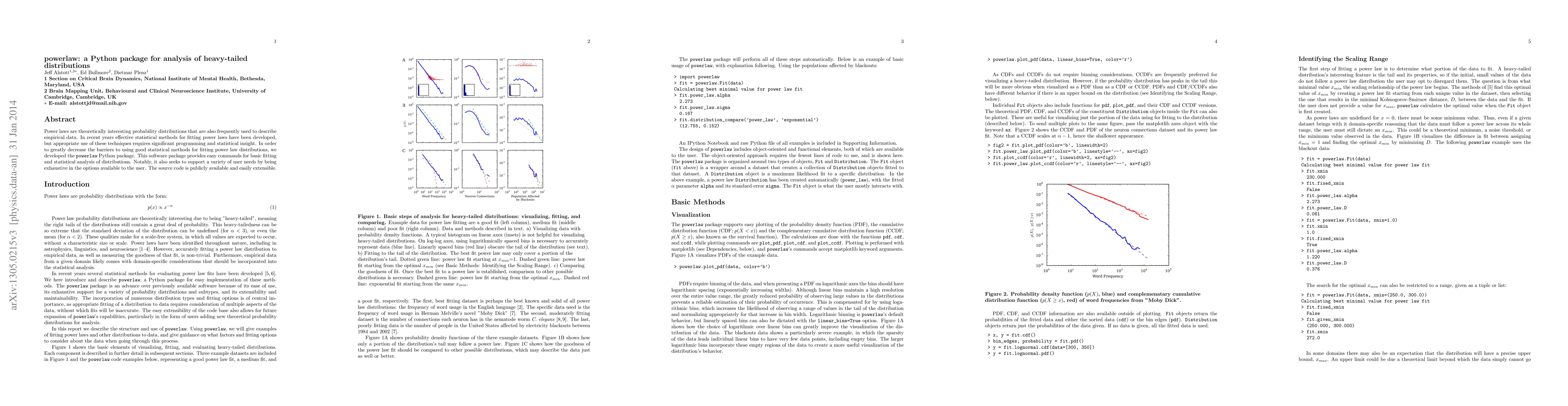 The powerlaw Python package simplifies the analysis of heavy-tailed distributions using power laws, offering extensive fitting and statistical analysis options while being publicly accessible and easily extensible. It aims to lower the barriers for users to apply advanced statistical methods for power law distribution fitting.