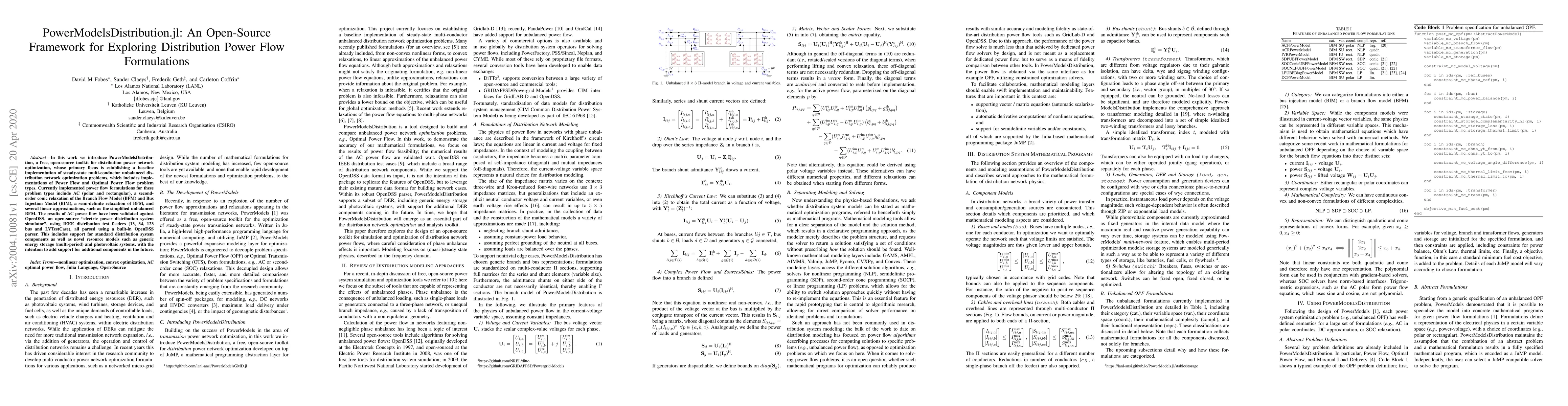 PowerModelsDistribution.jl is an open-source framework for optimizing distribution power networks, focusing on multi-conductor unbalanced network problems, including various power flow formulations. It has been validated against OpenDSS using IEEE test feeders and supports standard and novel components like energy storage and photovoltaic systems.