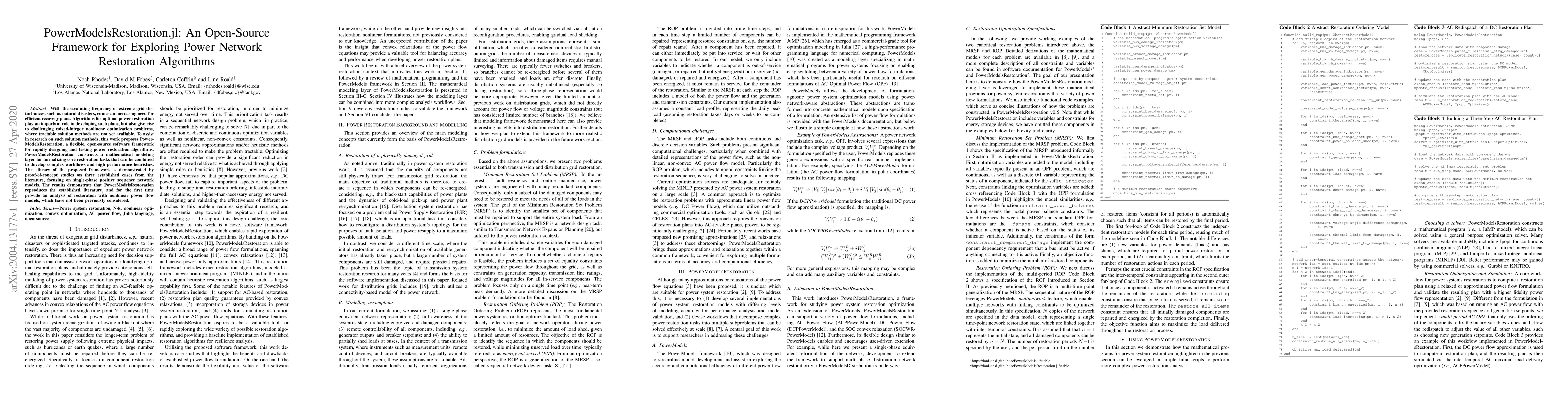 PowerModelsRestoration.jl is an open-source framework designed to facilitate research on power network restoration algorithms, addressing complex mixed-integer nonlinear optimization problems. It enables the rapid design and testing of restoration workflows and heuristics, as demonstrated by successful reproduction of established cases and initial analysis of nonlinear power flow models.