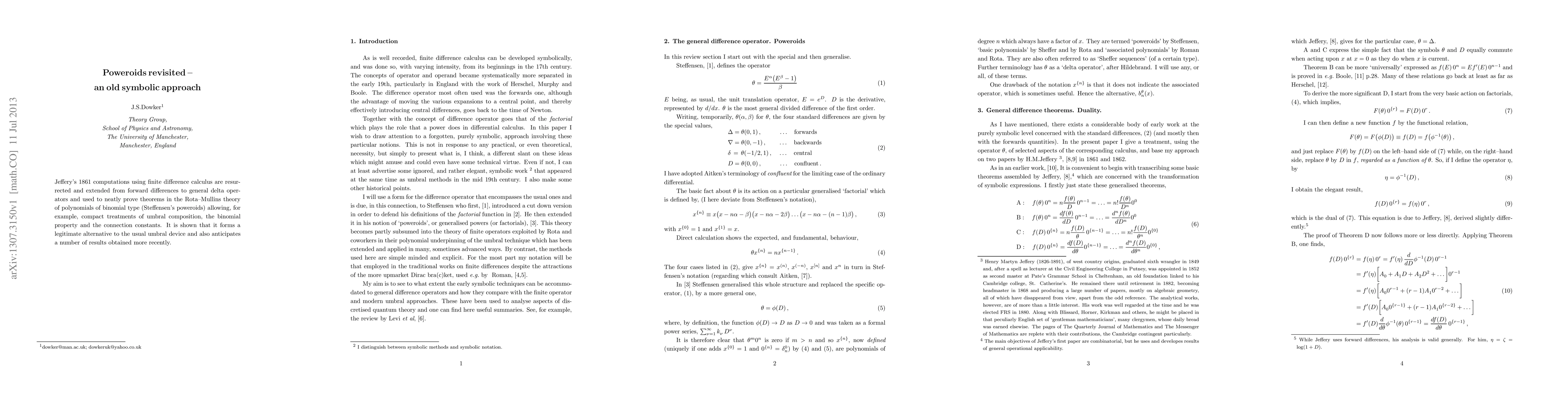 Jeffery's 1861 computations using finite difference calculus are resurrected and extended from forward differences to general delta operators and used to neatly prove theorems in the Rota--Mullins theory of polynomials of binomial type (Steffensen's poweroids) allowing, for example, compact treatments of umbral composition, the binomial property and the connection constants. It is shown that it forms a legitimate alternative to the usual umbral device and also anticipates a number of results obtained more recently.