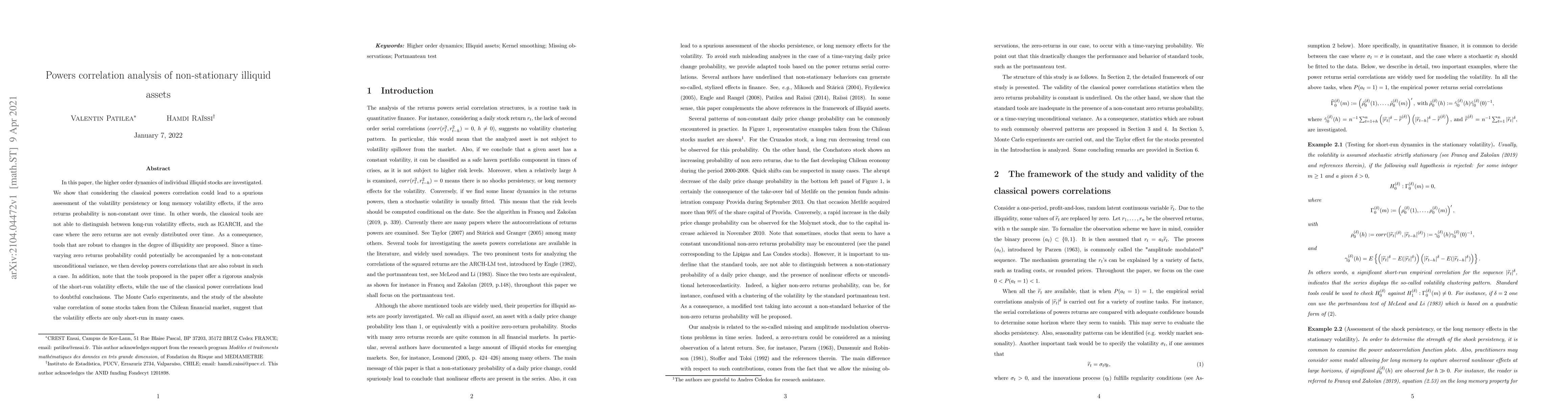 In this paper, the higher order dynamics of individual illiquid stocks are investigated. We show that considering the classical powers correlation could lead to a spurious assessment of the volatility persistency or long memory volatility effects, if the zero returns probability is non-constant over time. In other words, the classical tools are not able to distinguish between long-run volatility effects, such as IGARCH, and the case where the zero returns are not evenly distributed over time. As a consequence, tools that are robust to changes in the degree of illiquidity are proposed. Since a time-varying zero returns probability could potentially be accompanied by a non-constant unconditional variance, we then develop powers correlations that are also robust in such a case. In addition, note that the tools proposed in the paper offer a rigorous analysis of the short-run volatility effects, while the use of the classical power correlations lead to doubtful conclusions. The Monte Carlo experiments, and the study of the absolute value correlation of some stocks taken from the Chilean financial market, suggest that the volatility effects are only short-run in many cases.