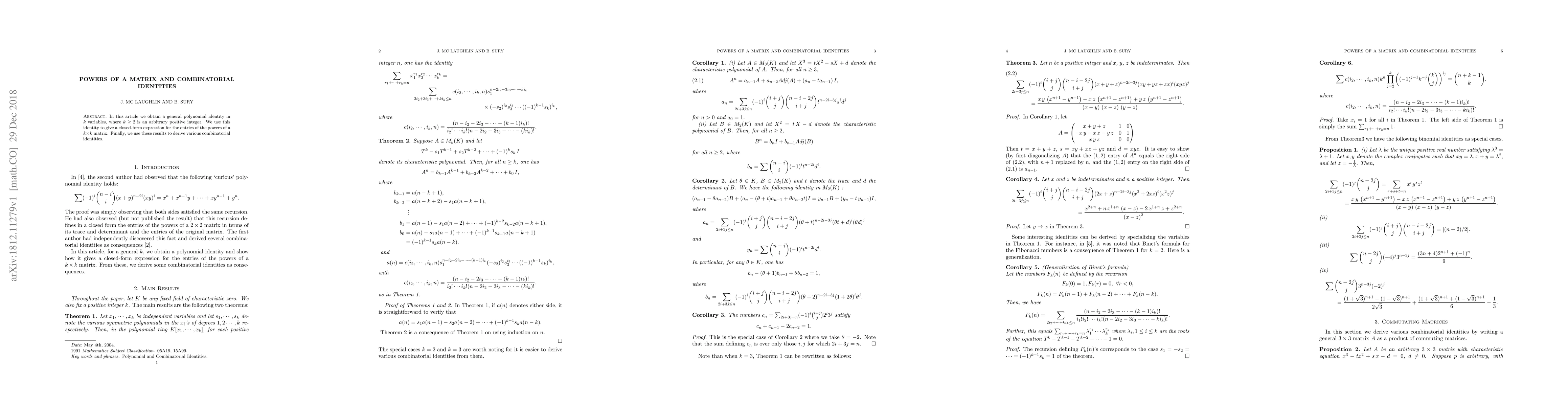 In this article we obtain a general polynomial identity in $k$ variables, where $k\geq 2$ is an arbitrary positive integer. We use this identity to give a closed-form expression for the entries of the powers of a $k \times k$ matrix. Finally, we use these results to derive various combinatorial identities.