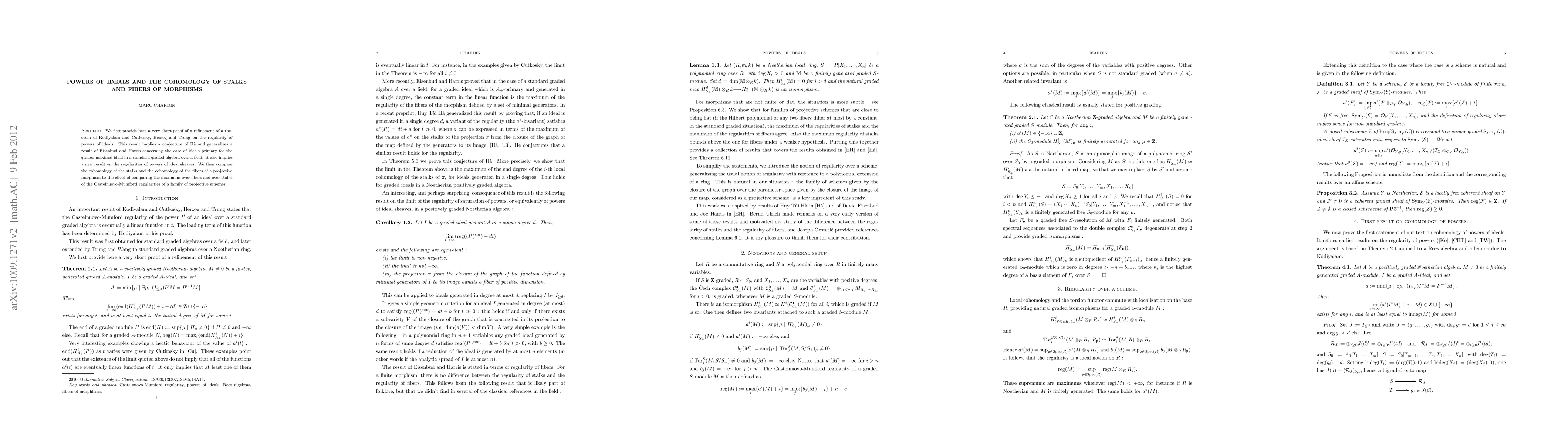 We first provide here a very short proof of a refinement of a theorem of Kodiyalam and Cutkosky, Herzog and Trung on the regularity of powers of ideals. This result implies a conjecture of H\`a and generalizes a result of Eisenbud and Harris concerning the case of ideals primary for the graded maximal ideal in a standard graded algebra over a field. It also implies a new result on the regularities of powers of ideal sheaves. We then compare the cohomology of the stalks and the cohomology of the fibers of a projective morphism to the effect of comparing the maximum over fibers and over stalks of the Castelnuovo-Mumford regularities of a family of projective schemes.