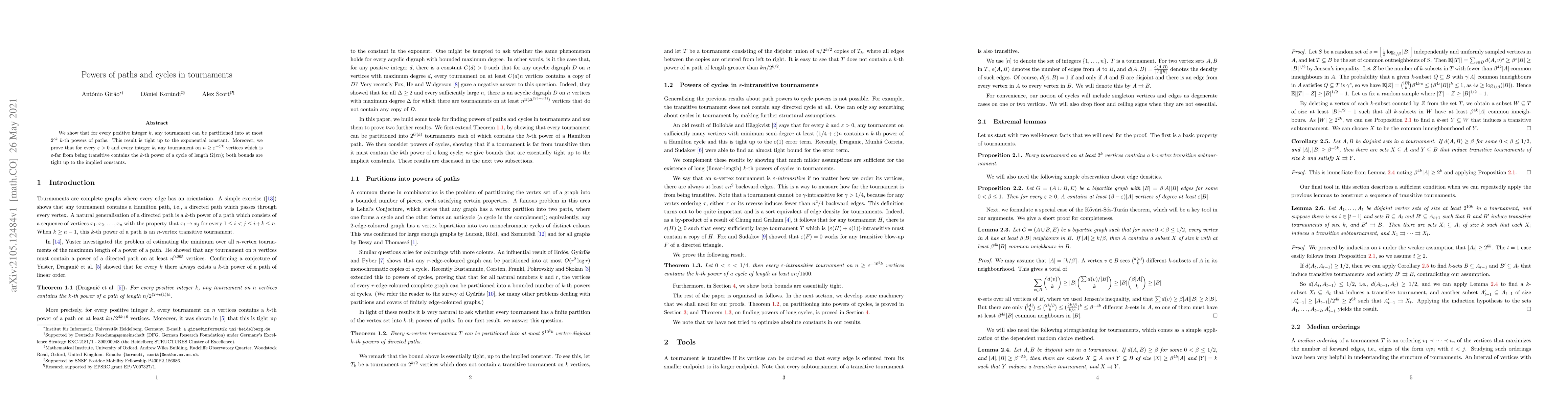 Researchers show that any tournament can be divided into parts that are either k-th powers of paths or cycles, with specific size bounds related to the number of vertices in the tournament.