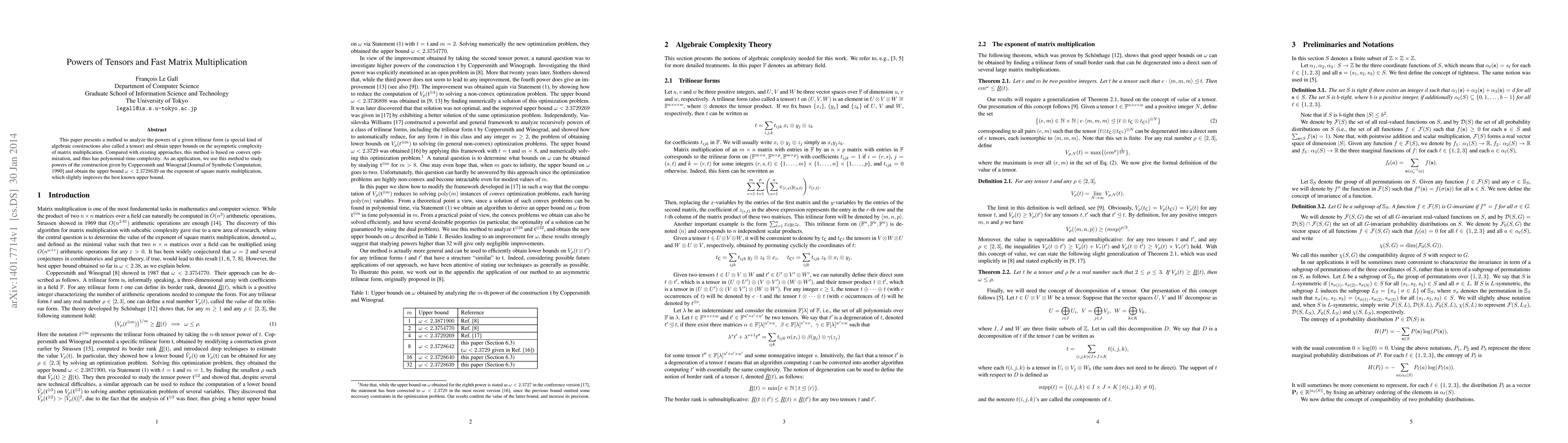 This paper presents a method to analyze the powers of a given trilinear form (a special kind of algebraic constructions also called a tensor) and obtain upper bounds on the asymptotic complexity of matrix multiplication. Compared with existing approaches, this method is based on convex optimization, and thus has polynomial-time complexity. As an application, we use this method to study powers of the construction given by Coppersmith and Winograd [Journal of Symbolic Computation, 1990] and obtain the upper bound $\omega<2.3728639$ on the exponent of square matrix multiplication, which slightly improves the best known upper bound.