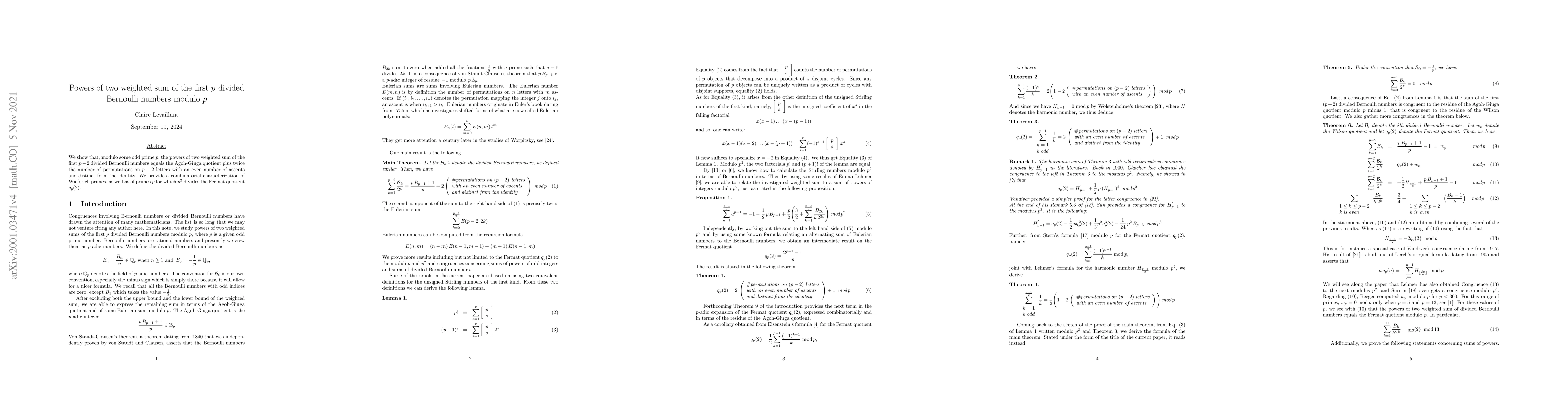 Summary: This paper demonstrates a relationship between the powers of a weighted sum of Bernoulli numbers modulo an odd prime p and combinatorial properties of permutations, providing insights into Wiefeich primes and primes dividing the Fermat quotient.