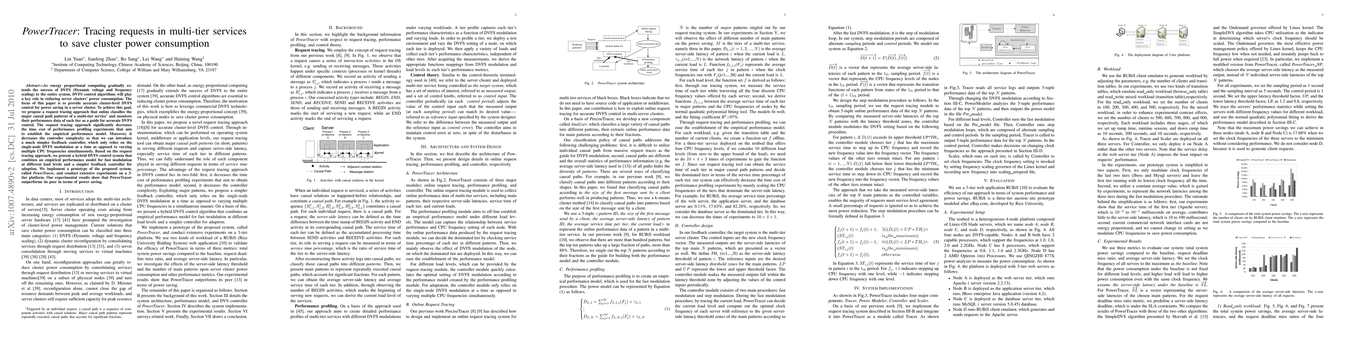 The paper proposes PowerTracer, a request tracing approach to accurately classify major causal path patterns in multi-tier services, enabling effective DVFS control for reducing server cluster power consumption. Experimental results show PowerTracer significantly outperforms peers in power saving and system performance.