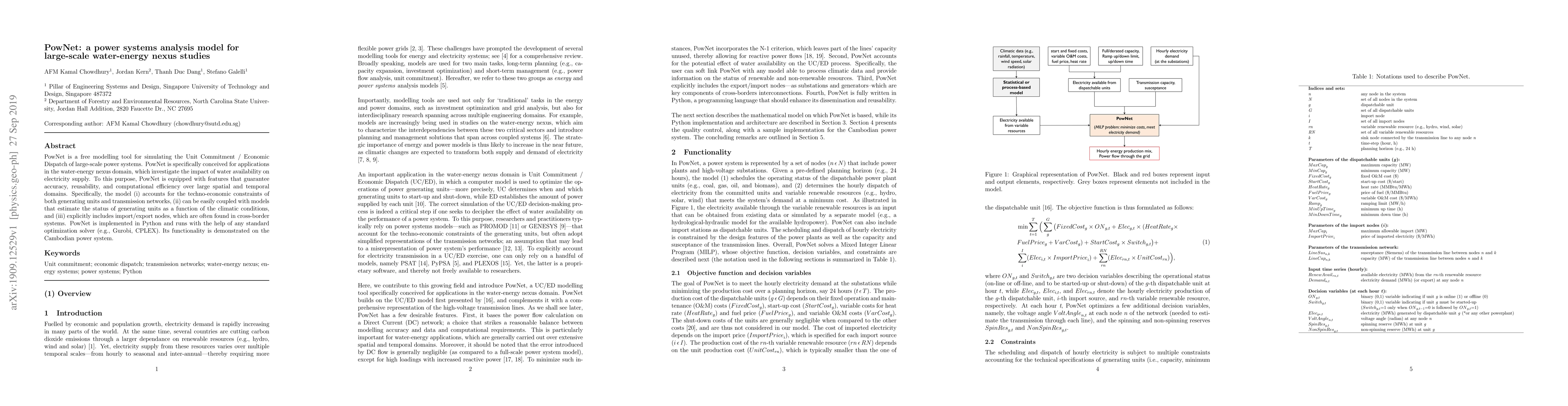 PowNet is a Python-based tool for simulating power system operations, tailored for water-energy nexus studies. It models Unit Commitment/Economic Dispatch, considering techno-economic constraints and climate impacts, and is demonstrated on the Cambodian power system.