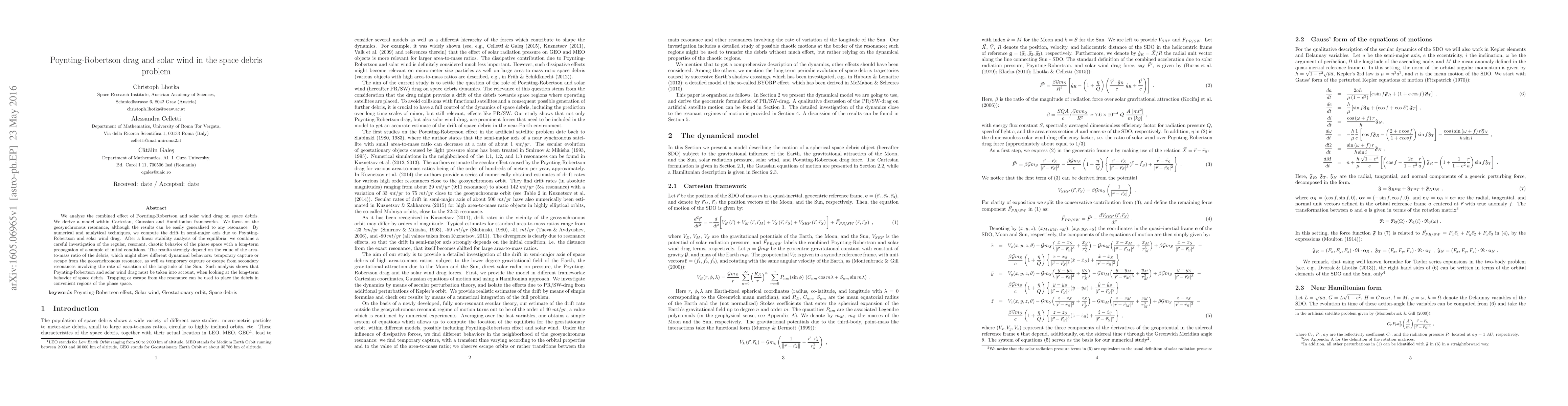 This paper investigates the combined effects of Poynting-Robertson drag and solar wind on space debris dynamics, deriving a model applicable to geosynchronous and other resonances. The study reveals that debris behavior depends on area-to-mass ratio, potentially leading to capture or escape from resonances, highlighting the importance of considering these forces for long-term debris management.