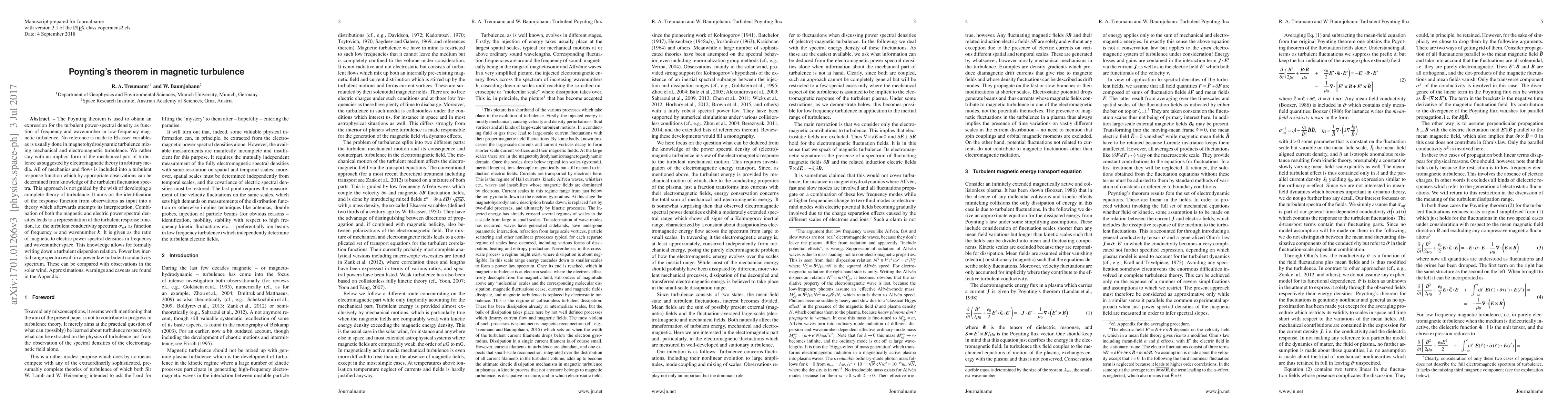 This paper applies Poynting's theorem to derive the turbulent power-spectral density in low-frequency magnetic turbulence without using Elsasser variables, focusing instead on an implicit mechanical turbulence model. The study aims to identify a turbulent response function from observations, leading to a representation of the turbulent conductivity spectrum $\sigma_{\omega k}$, which can be compared with solar wind turbulence observations.
