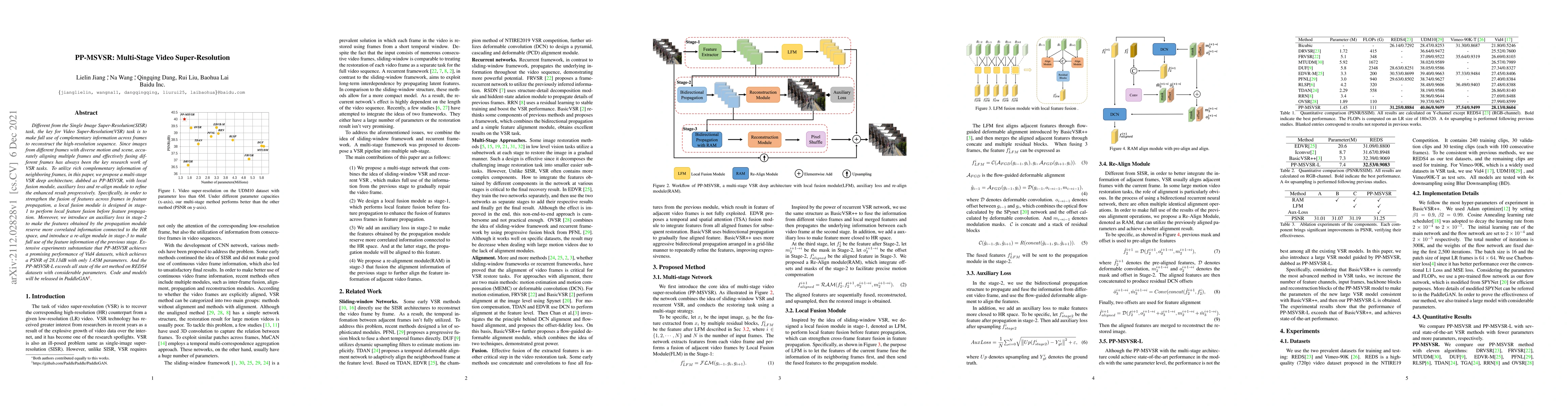 This paper proposes PP-MSVSR, a multi-stage deep architecture for Video Super-Resolution (VSR) that progressively refines high-resolution sequences by leveraging complementary information across frames. The method includes a local fusion module, auxiliary loss, and re-align module, achieving state-of-the-art results on Vid4 and REDS4 datasets.