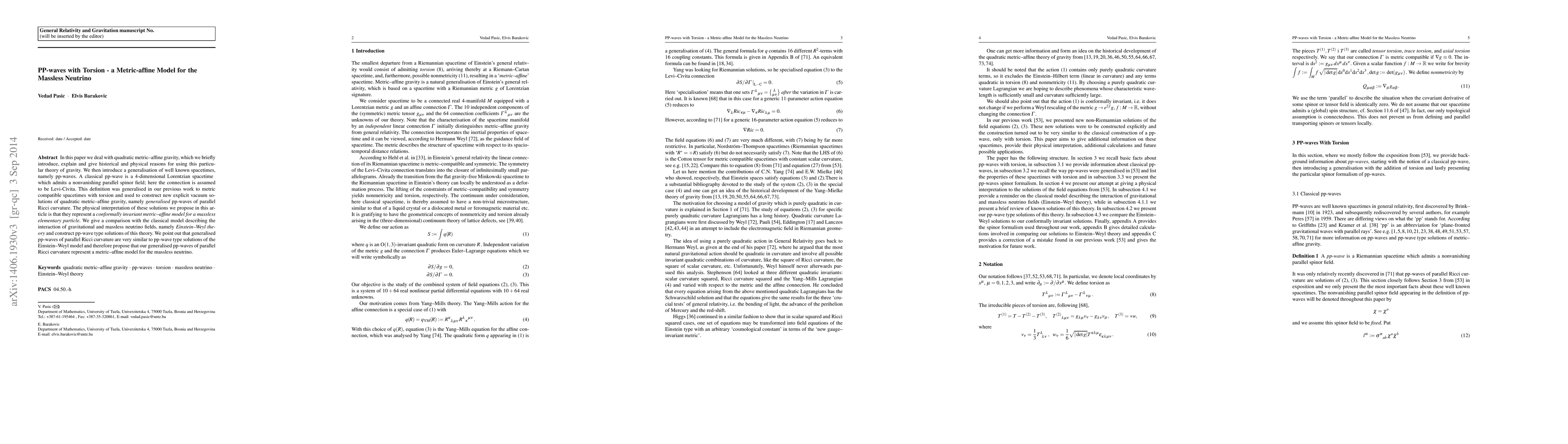 In this paper we deal with quadratic metric-affine gravity, which we briefly introduce, explain and give historical and physical reasons for using this particular theory of gravity. Further, we introduce a generalisation of well known spacetimes, namely pp-waves. A classical pp-wave is a 4-dimensional Lorentzian spacetime, which admits a nonvanishing parallel spinor field; here the connection is assumed to be Levi-Civita. This definition was generalised in our previous work to metric compatible spacetimes with torsion and used to construct new explicit vacuum solutions of quadratic metric-affine gravity, namely generalised pp-waves of parallel Ricci curvature. The physical interpretation of these solutions we propose in this article is that they represent a conformally invariant metric-affine model for a massless elementary particle. We give a comparison with the classical model describing the interaction of gravitational and massless neutrino fields, namely Einstein-Weyl theory and construct pp-wave type solutions of this theory. We point out that generalised pp-waves of parallel Ricci curvature are very similar to pp-wave type solutions of the Einstein-Weyl model and therefore propose that our generalised pp-waves of parallel Ricci curvature represent a metric-affine model for the massless neutrino.