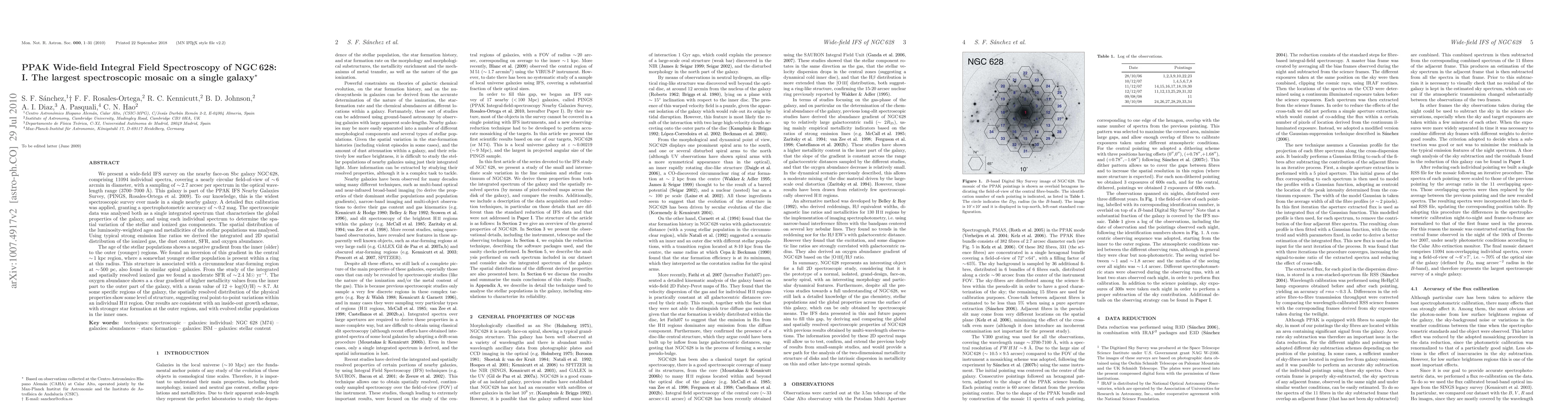 The research employs PPAK Wide-field Integral Field Spectroscopy (IFS) on the nearby face-on Sbc galaxy NGC 628, covering a nearly circular field-of-view of ~6 arcmin in diameter with ~2.7 arcsec per spectrum sampling in the optical wavelength range (3700--7000 AA). A detailed flux calibration was applied, granting a spectrophotometric accuracy of ~0.2 mag.
