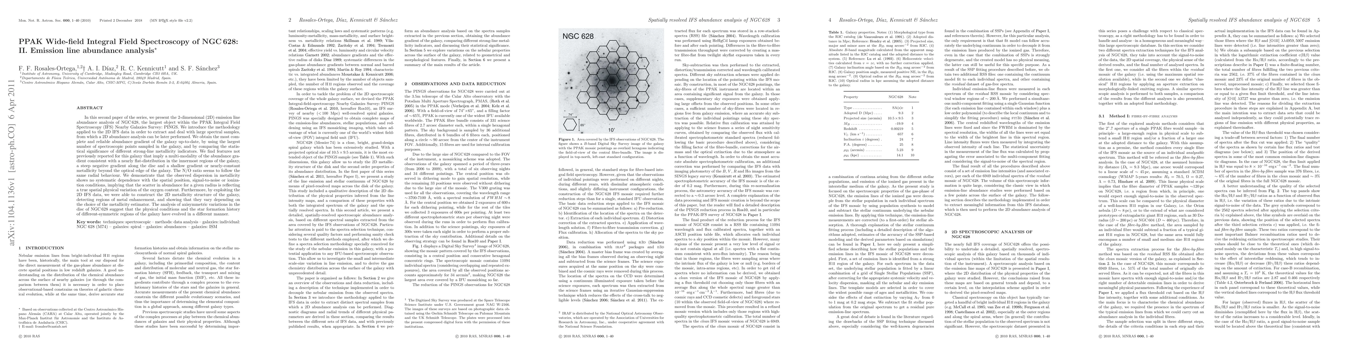 This paper presents a comprehensive 2D emission line abundance analysis of NGC 628 using PPAK IFS data, revealing a complex abundance gradient with a nearly flat distribution in the inner regions, a steep negative gradient in the disc, and a shallow gradient beyond the optical edge. The study also highlights the physical variations in oxygen content and the differing star formation histories across the galaxy's disc.