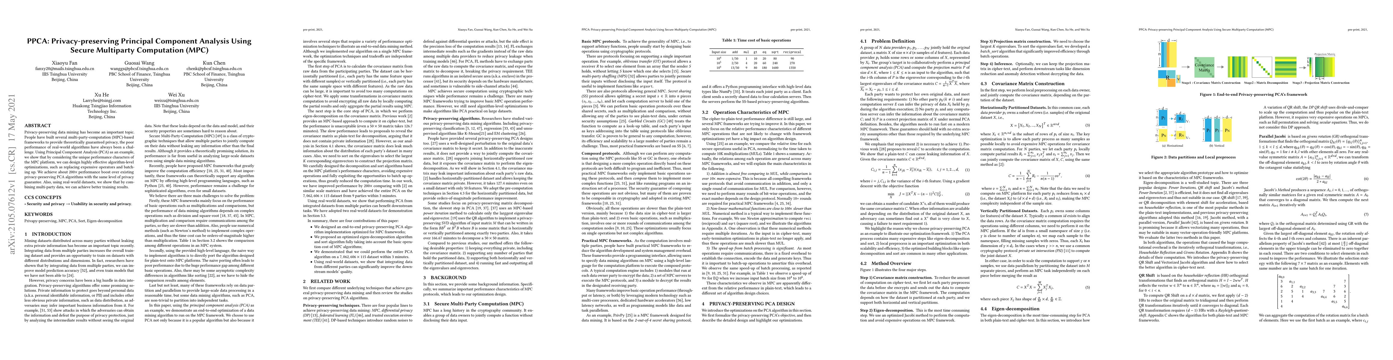 Privacy-preserving data mining has become an important topic. People have built several multi-party-computation (MPC)-based frameworks to provide theoretically guaranteed privacy, the poor performance of real-world algorithms have always been a challenge. Using Principal Component Analysis (PCA) as an example, we show that by considering the unique performance characters of the MPC platform, we can design highly effective algorithm-level optimizations, such as replacing expensive operators and batching up. We achieve about 200$\times$ performance boost over existing privacy-preserving PCA algorithms with the same level of privacy guarantee. Also, using real-world datasets, we show that by combining multi-party data, we can achieve better training results.