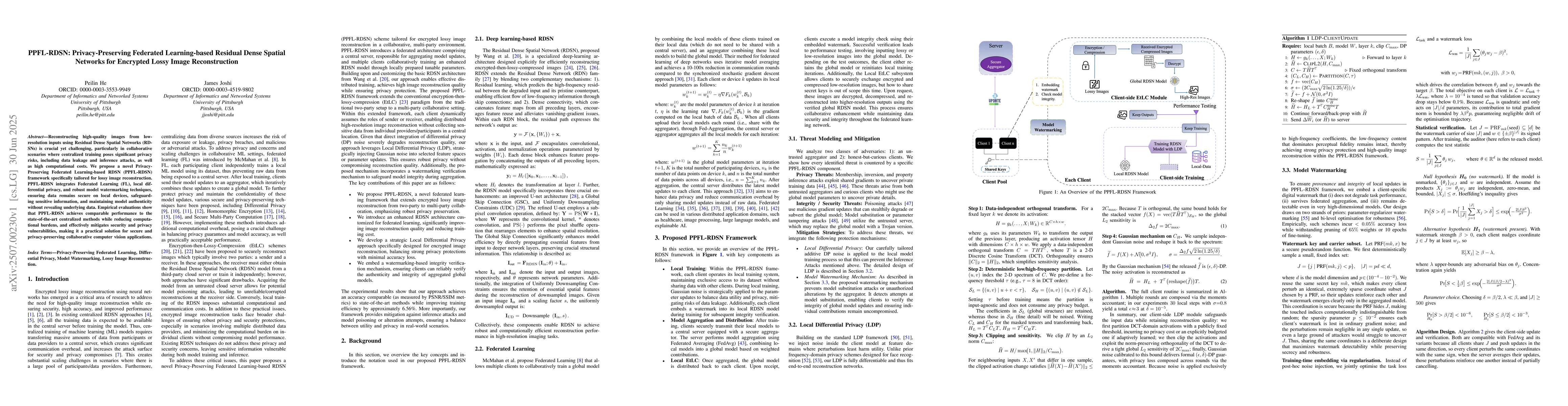 Reconstructing high-quality images from low-resolution inputs using Residual Dense Spatial Networks (RDSNs) is crucial yet challenging, particularly in collaborative scenarios where centralized training poses significant privacy risks, including data leakage and inference attacks, as well as high computational costs. We propose a novel Privacy-Preserving Federated Learning-based RDSN (PPFL-RDSN) framework specifically tailored for lossy image reconstruction. PPFL-RDSN integrates Federated Learning (FL), local differential privacy, and robust model watermarking techniques, ensuring data remains secure on local devices, safeguarding sensitive information, and maintaining model authenticity without revealing underlying data. Empirical evaluations show that PPFL-RDSN achieves comparable performance to the state-of-the-art centralized methods while reducing computational burdens, and effectively mitigates security and privacy vulnerabilities, making it a practical solution for secure and privacy-preserving collaborative computer vision applications.