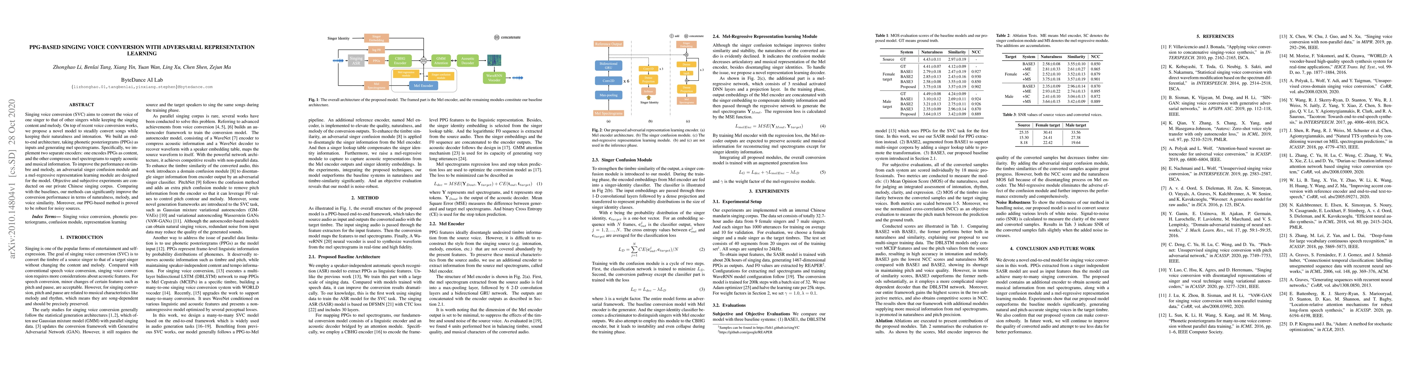 Singing voice conversion (SVC) aims to convert the voice of one singer to that of other singers while keeping the singing content and melody. On top of recent voice conversion works, we propose a novel model to steadily convert songs while keeping their naturalness and intonation. We build an end-to-end architecture, taking phonetic posteriorgrams (PPGs) as inputs and generating mel spectrograms. Specifically, we implement two separate encoders: one encodes PPGs as content, and the other compresses mel spectrograms to supply acoustic and musical information. To improve the performance on timbre and melody, an adversarial singer confusion module and a mel-regressive representation learning module are designed for the model. Objective and subjective experiments are conducted on our private Chinese singing corpus. Comparing with the baselines, our methods can significantly improve the conversion performance in terms of naturalness, melody, and voice similarity. Moreover, our PPG-based method is proved to be robust for noisy sources.