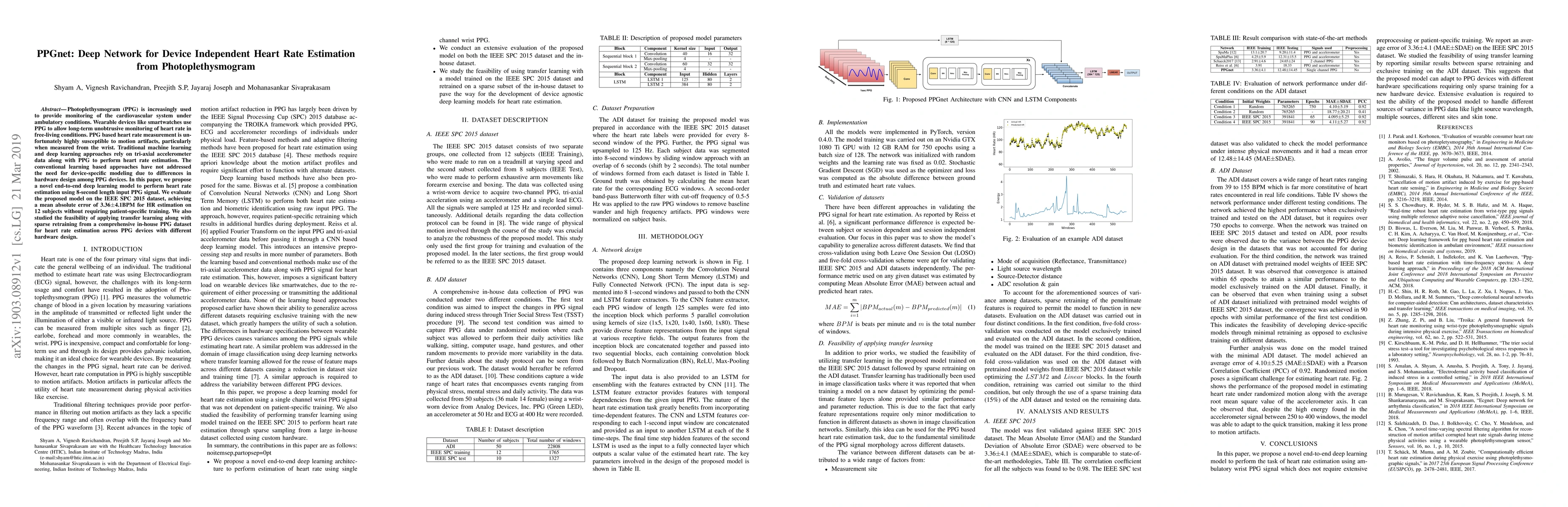 Photoplethysmogram (PPG) is increasingly used to provide monitoring of the cardiovascular system under ambulatory conditions. Wearable devices like smartwatches use PPG to allow long term unobtrusive monitoring of heart rate in free living conditions. PPG based heart rate measurement is unfortunately highly susceptible to motion artifacts, particularly when measured from the wrist. Traditional machine learning and deep learning approaches rely on tri-axial accelerometer data along with PPG to perform heart rate estimation. The conventional learning based approaches have not addressed the need for device-specific modeling due to differences in hardware design among PPG devices. In this paper, we propose a novel end to end deep learning model to perform heart rate estimation using 8 second length input PPG signal. We evaluate the proposed model on the IEEE SPC 2015 dataset, achieving a mean absolute error of 3.36+-4.1BPM for HR estimation on 12 subjects without requiring patient specific training. We also studied the feasibility of applying transfer learning along with sparse retraining from a comprehensive in house PPG dataset for heart rate estimation across PPG devices with different hardware design.