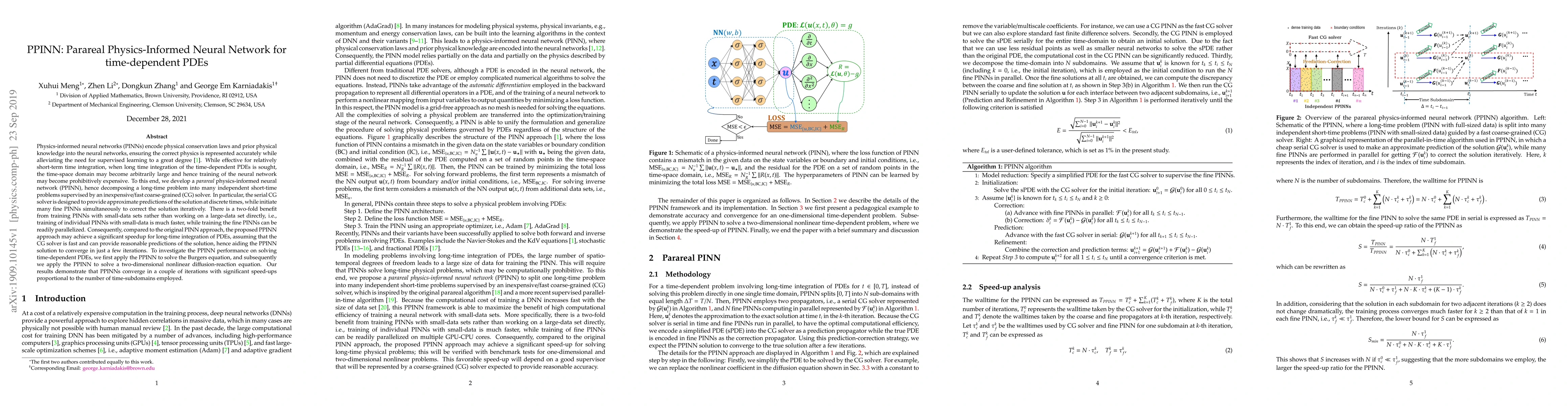 The PPINN method decomposes long-time integration of time-dependent PDEs into multiple short-time problems, leveraging a coarse-grained solver to iteratively refine fine PINNs, achieving significant speedups compared to traditional PINNs. The approach demonstrates effective convergence and performance on solving the Burgers equation and a two-dimensional nonlinear diffusion-reaction equation.