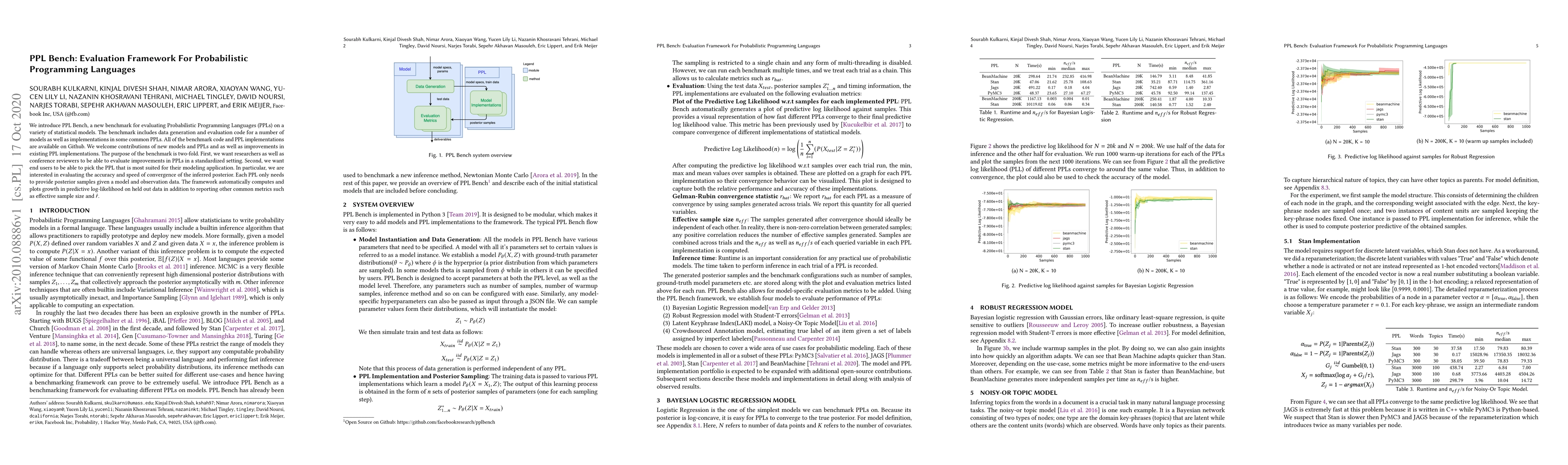 We introduce PPL Bench, a new benchmark for evaluating Probabilistic Programming Languages (PPLs) on a variety of statistical models. The benchmark includes data generation and evaluation code for a number of models as well as implementations in some common PPLs. All of the benchmark code and PPL implementations are available on Github. We welcome contributions of new models and PPLs and as well as improvements in existing PPL implementations. The purpose of the benchmark is two-fold. First, we want researchers as well as conference reviewers to be able to evaluate improvements in PPLs in a standardized setting. Second, we want end users to be able to pick the PPL that is most suited for their modeling application. In particular, we are interested in evaluating the accuracy and speed of convergence of the inferred posterior. Each PPL only needs to provide posterior samples given a model and observation data. The framework automatically computes and plots growth in predictive log-likelihood on held out data in addition to reporting other common metrics such as effective sample size and $\hat{r}$.
