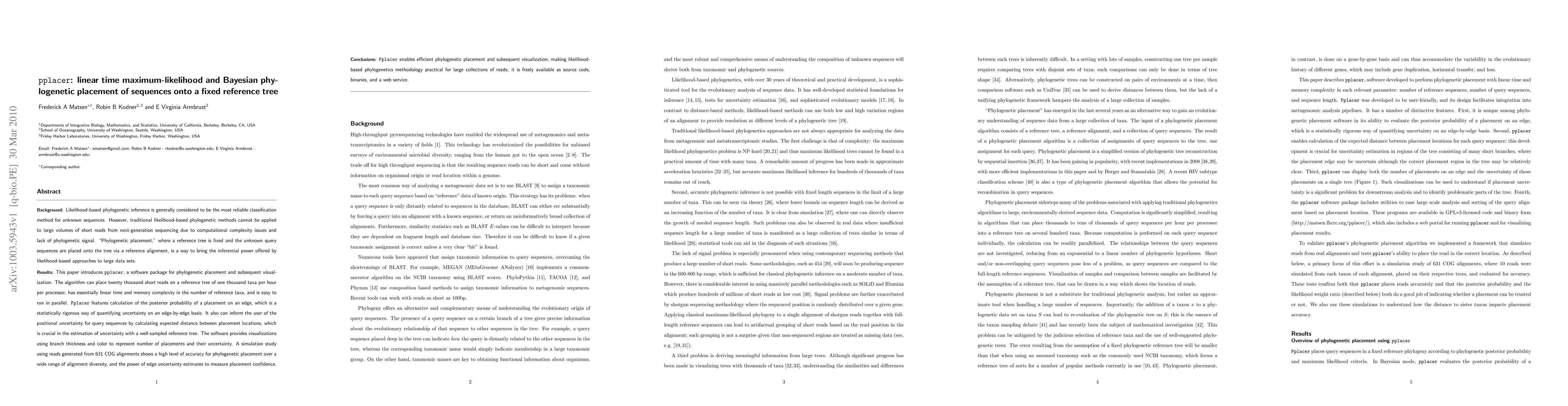 A new software package called pplacer enables efficient phylogenetic placement of short reads onto a fixed reference tree, offering linear time complexity and visualization capabilities.