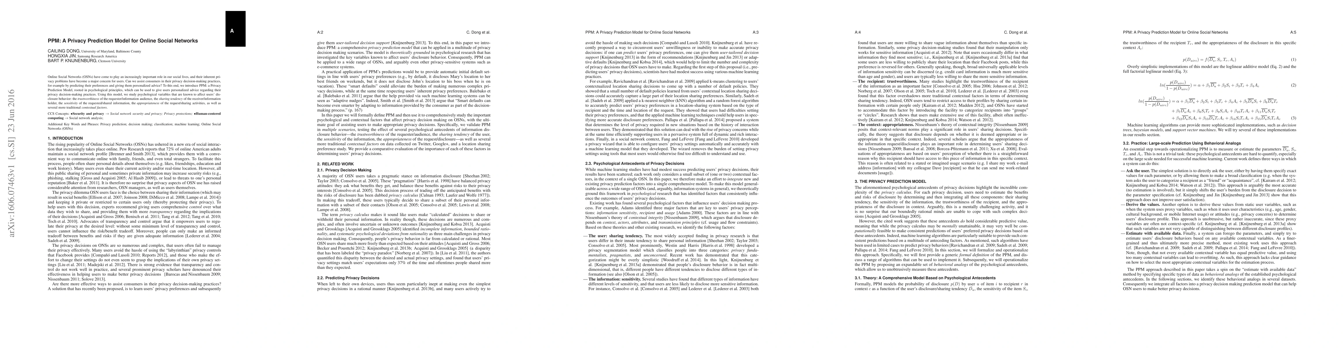 The PPM model predicts users' privacy preferences and disclosure behaviors in online social networks based on psychological factors like requester trustworthiness and information sensitivity, offering personalized privacy advice. It examines how various psychological and contextual variables influence users' decisions to share personal information.