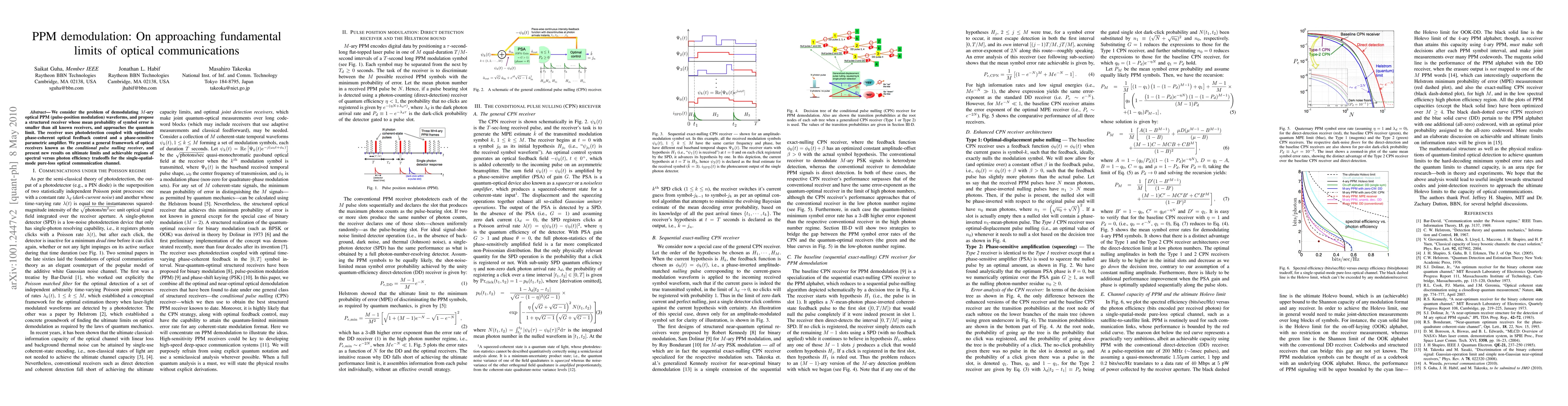 We consider the problem of demodulating M-ary optical PPM (pulse-position modulation) waveforms, and propose a structured receiver whose mean probability of symbol error is smaller than all known receivers, and approaches the quantum limit. The receiver uses photodetection coupled with optimized phase-coherent optical feedback control and a phase-sensitive parametric amplifier. We present a general framework of optical receivers known as the conditional pulse nulling receiver, and present new results on ultimate limits and achievable regions of spectral versus photon efficiency tradeoffs for the single-spatial-mode pure-loss optical communication channel.