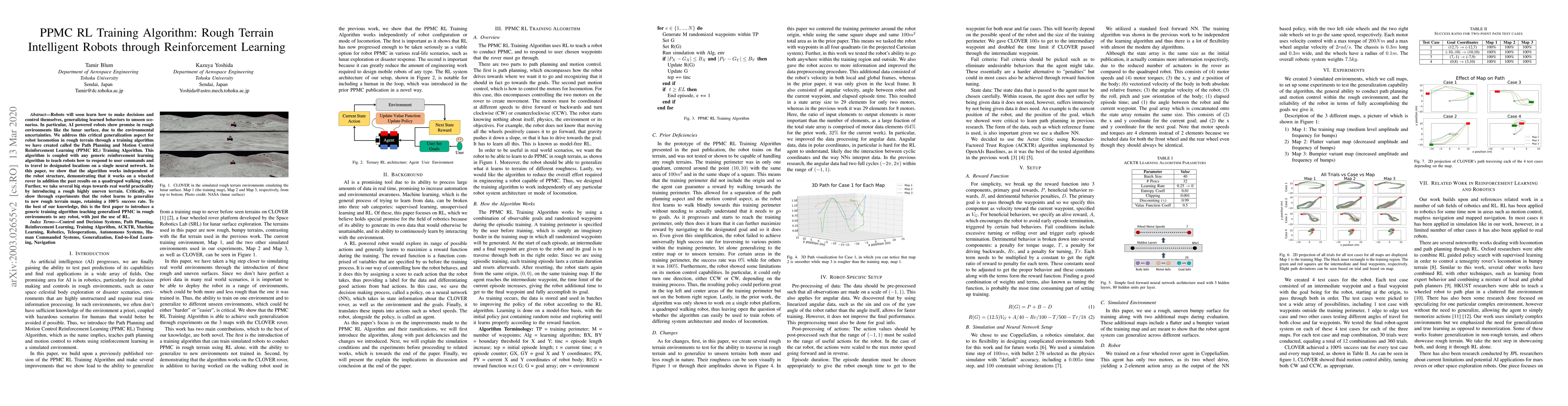 This paper presents a PPMC RL Training Algorithm that enables robots to learn generalized locomotion in rough terrains using reinforcement learning, demonstrating success on both wheeled rovers and quadrupeds, and achieving 100% success rate in new terrains. The algorithm is the first of its kind to teach generalized path planning and motion control in rough environments without specific robot structure dependencies.