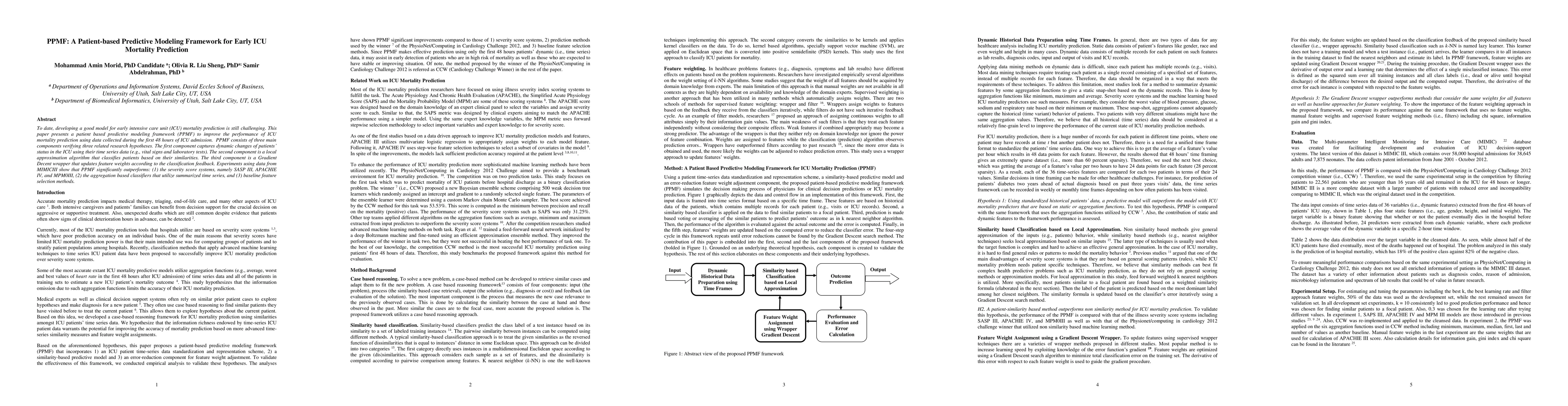 The PPMF framework enhances early ICU mortality prediction by modeling dynamic patient status changes using time series data, classifying patients via local approximation, and refining feature weights through gradient descent. Experiments demonstrate PPMF's superior performance over existing severity score systems and other predictive models.