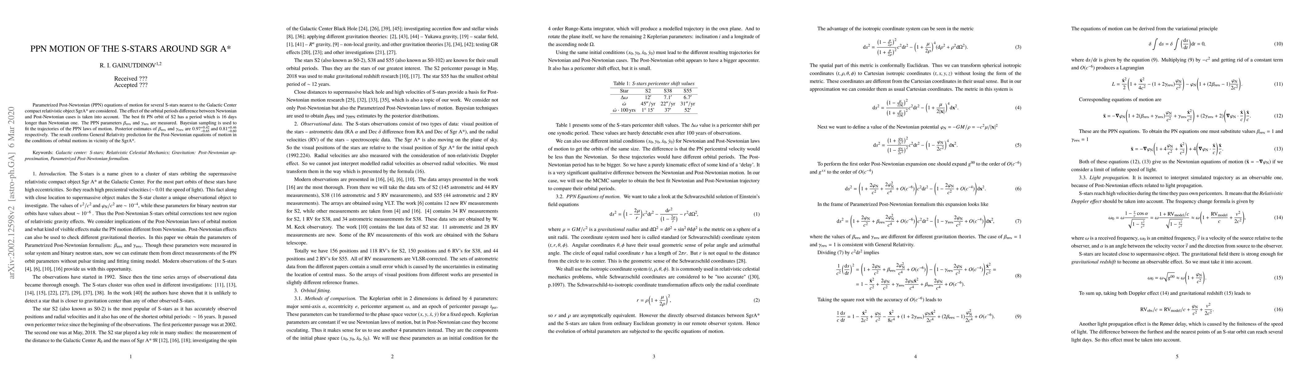 Parametrized Post-Newtonian (PPN) equations of motion for several S-stars nearest to the Galactic Center compact relativistic object SgrA* are considered. The effect of the orbital periods difference between Newtonian and Post-Newtonian cases is taken into account. The best fit PN orbit of S2 has a period which is 16 days longer than Newtonian one. The PPN parameters $\beta_\text{PPN}$ and $\gamma_\text{PPN}$ are measured. Bayesian sampling is used to fit the trajectories of the PPN laws of motion. Posterior estimates of $\beta_\text{PPN}$ and $\gamma_\text{PPN}$ are $0.97^{+0.42}_{-0.65}$ and $0.81^{+0.46}_{-0.60}$ respectively. The result confirms General Relativity prediction for the Post-Newtonian equations of motion in the conditions of orbital motions in vicinity of the SgrA*.