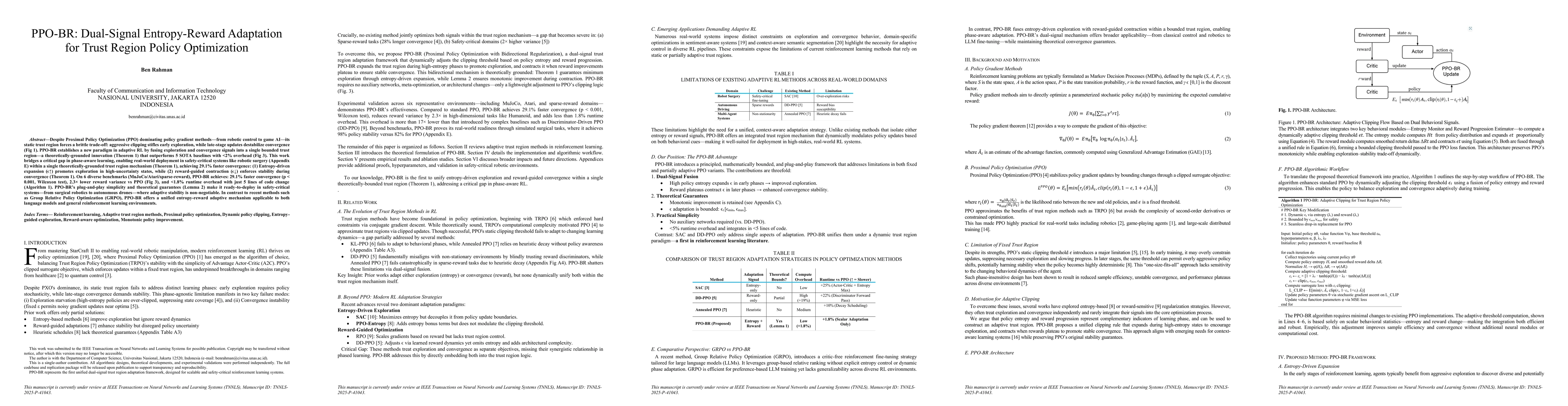 PPO-BR establishes a new paradigm in adaptive RL by fusing exploration and convergence signals into a single bounded trust region, providing theoretically grounded improvements over existing PPO methods.