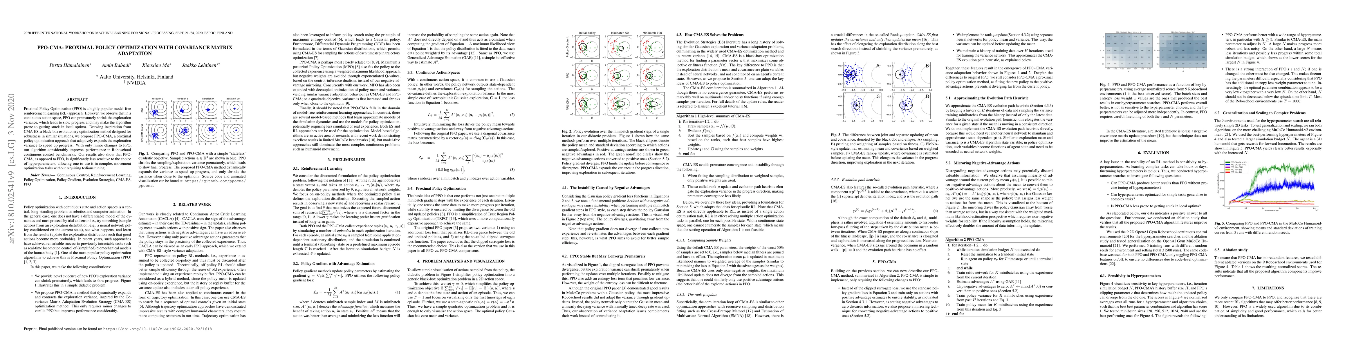 Summary: PPO-CMA enhances Proximal Policy Optimization (PPO) by adaptively increasing exploration variance to accelerate progress in continuous action spaces, inspired by the robustness of CMA-ES. This approach significantly improves performance and reduces sensitivity to hyperparameters in continuous control tasks.