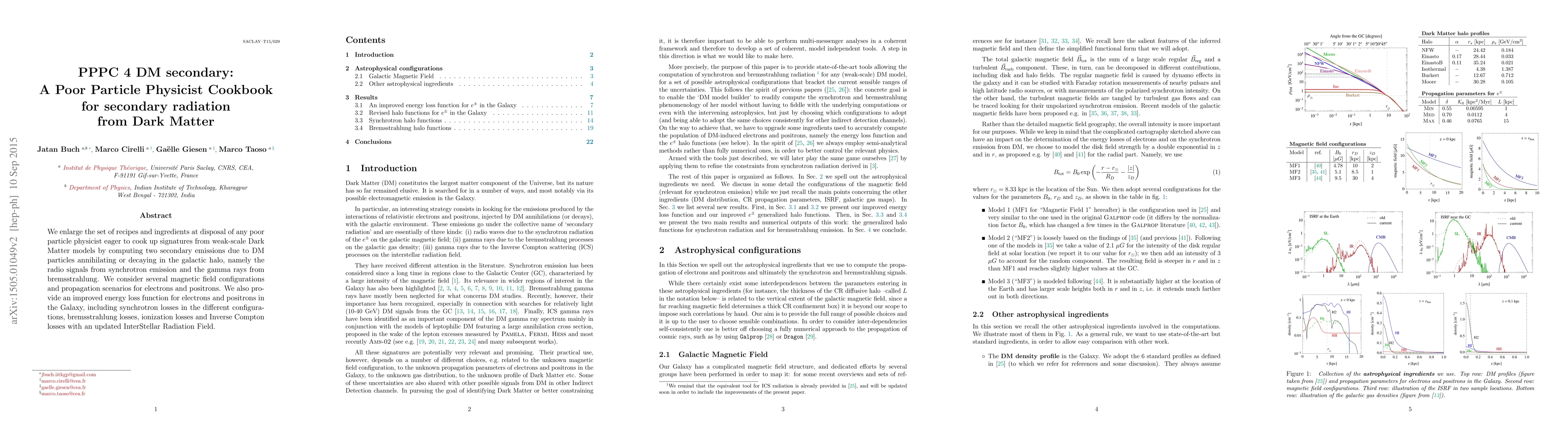 We enlarge the set of recipes and ingredients at disposal of any poor particle physicist eager to cook up signatures from weak-scale Dark Matter models by computing two secondary emissions due to DM particles annihilating or decaying in the galactic halo, namely the radio signals from synchrotron emission and the gamma rays from bremsstrahlung. We consider several magnetic field configurations and propagation scenarios for electrons and positrons. We also provide an improved energy loss function for electrons and positrons in the Galaxy, including synchrotron losses in the different configurations, bremsstrahlung losses, ionization losses and Inverse Compton losses with an updated InterStellar Radiation Field.