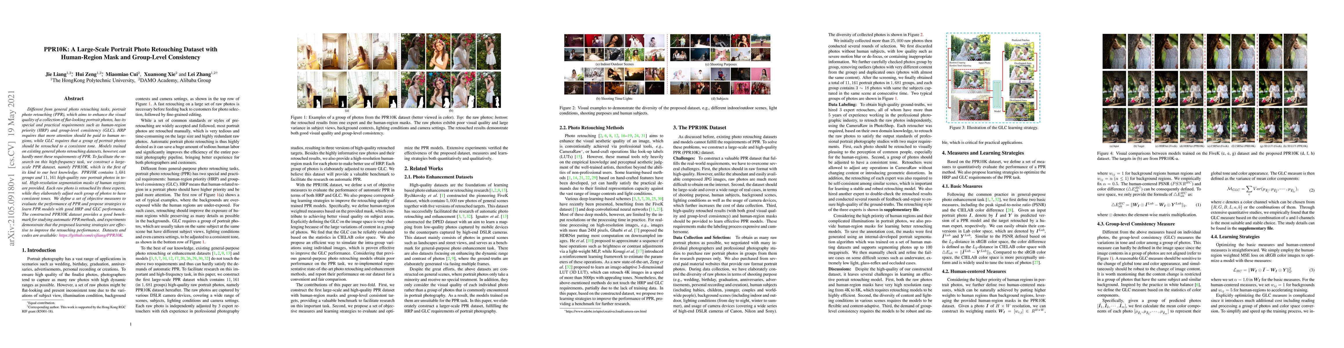 The PPR10K dataset is a large-scale collection of 11,161 portrait photos with human-region masks and group-level consistency, designed to meet the specialized requirements of portrait photo retouching. The dataset aims to enhance research on automatic portrait photo retouching by providing a benchmark for models that prioritize human regions and maintain consistent tones across groups.